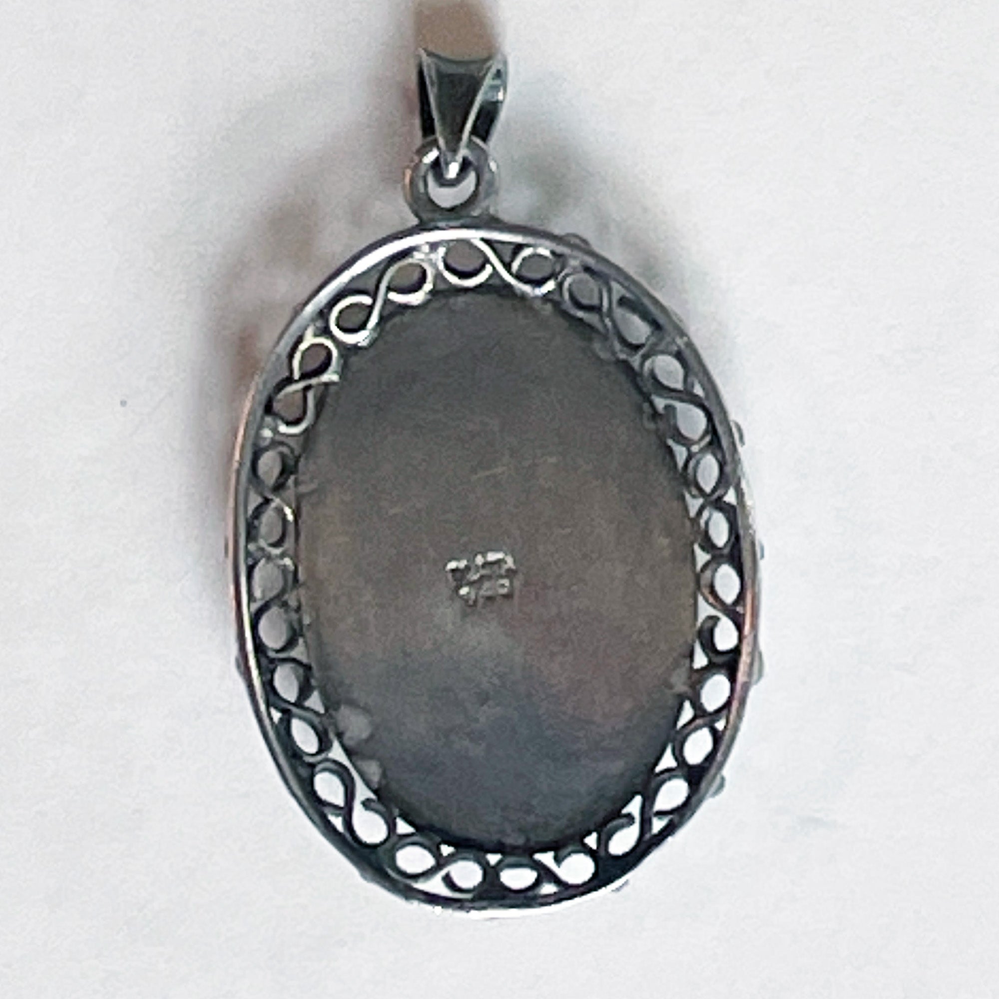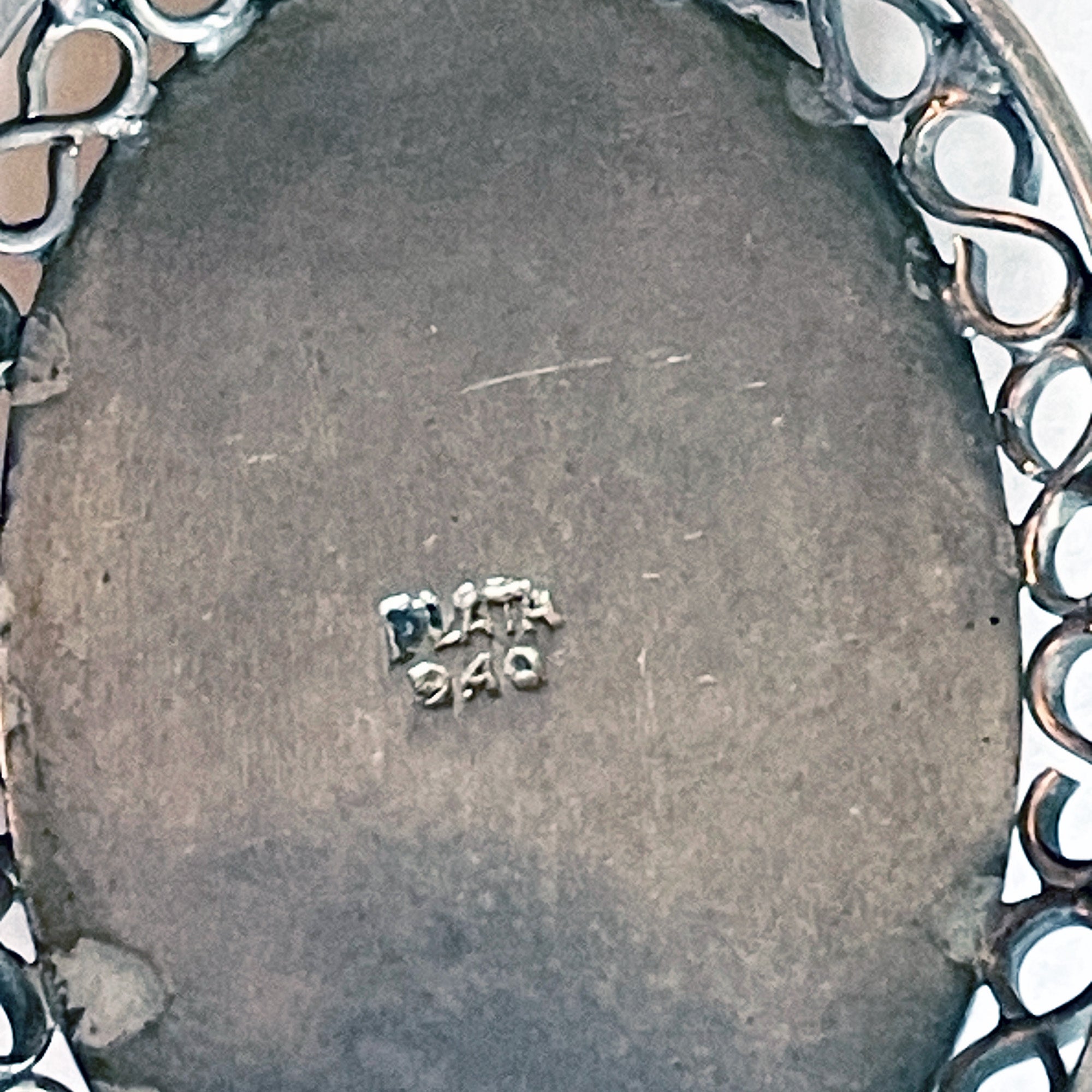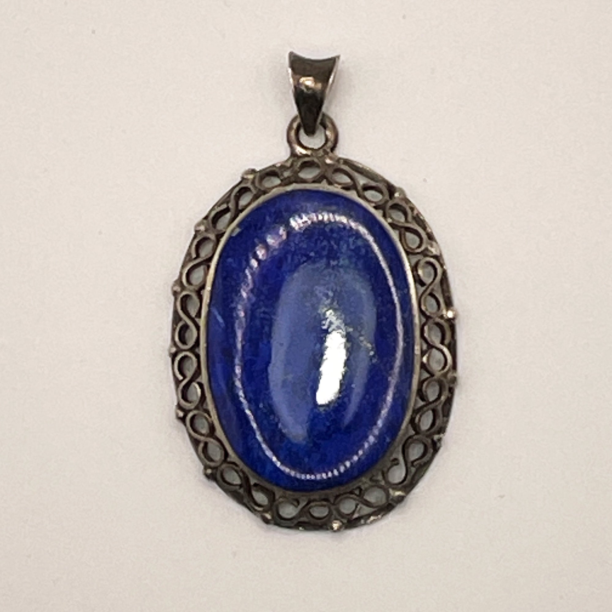 This beautiful lapis pendant is bezel set and surrounded by ornamental silver work. It is stamped with the Mexican silver mark “Plata 940” (or 940 silver).