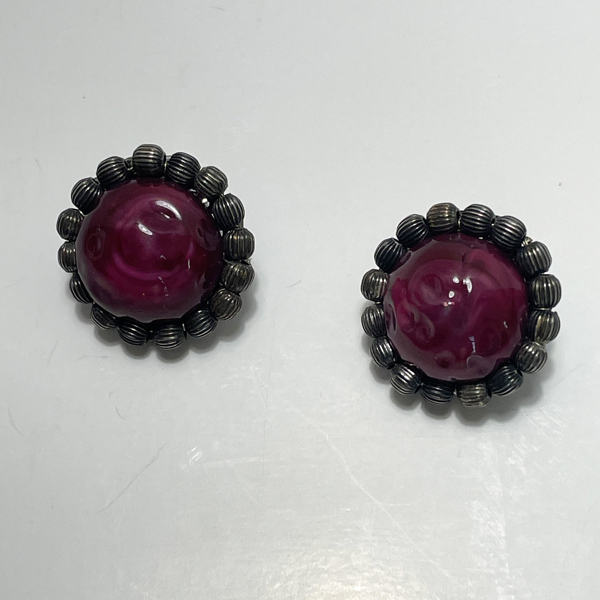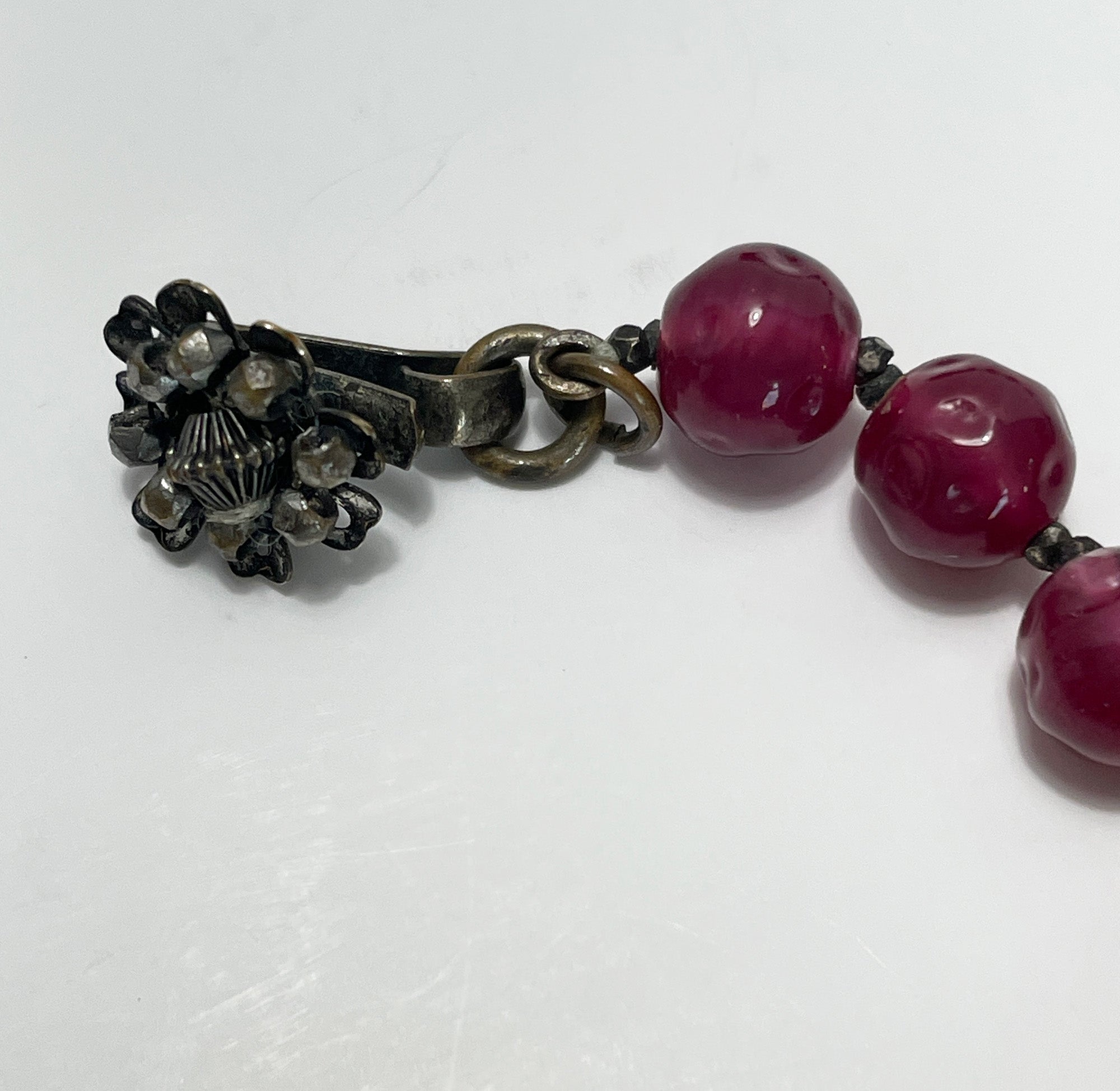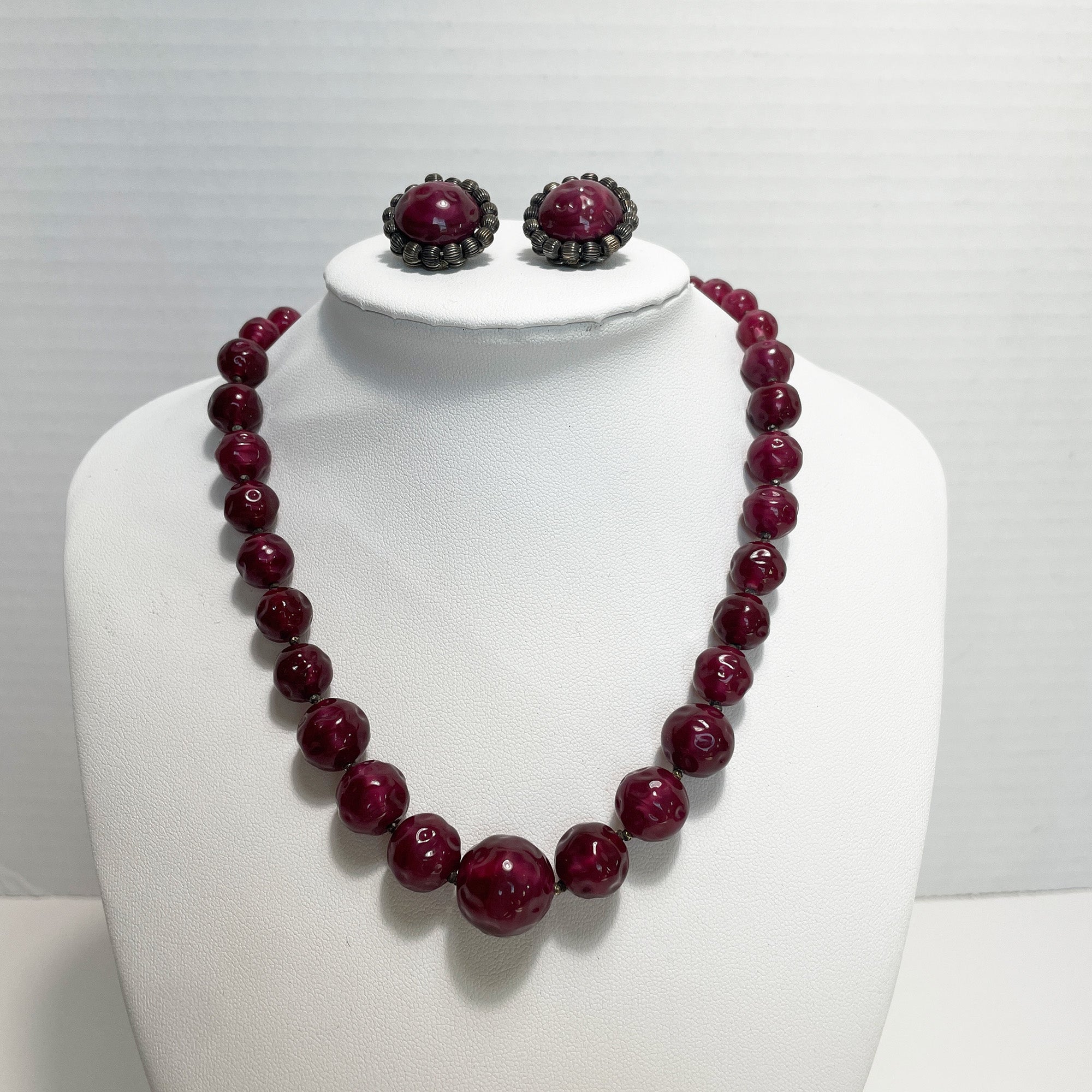 This stunning Miriam Haskell choker style necklace is strung in graduated plum colored poured glass beads. The hook clasp is decorated with intricate metal work. The earrings have the same gripoix beads with intricate metal work surrounding the bead.