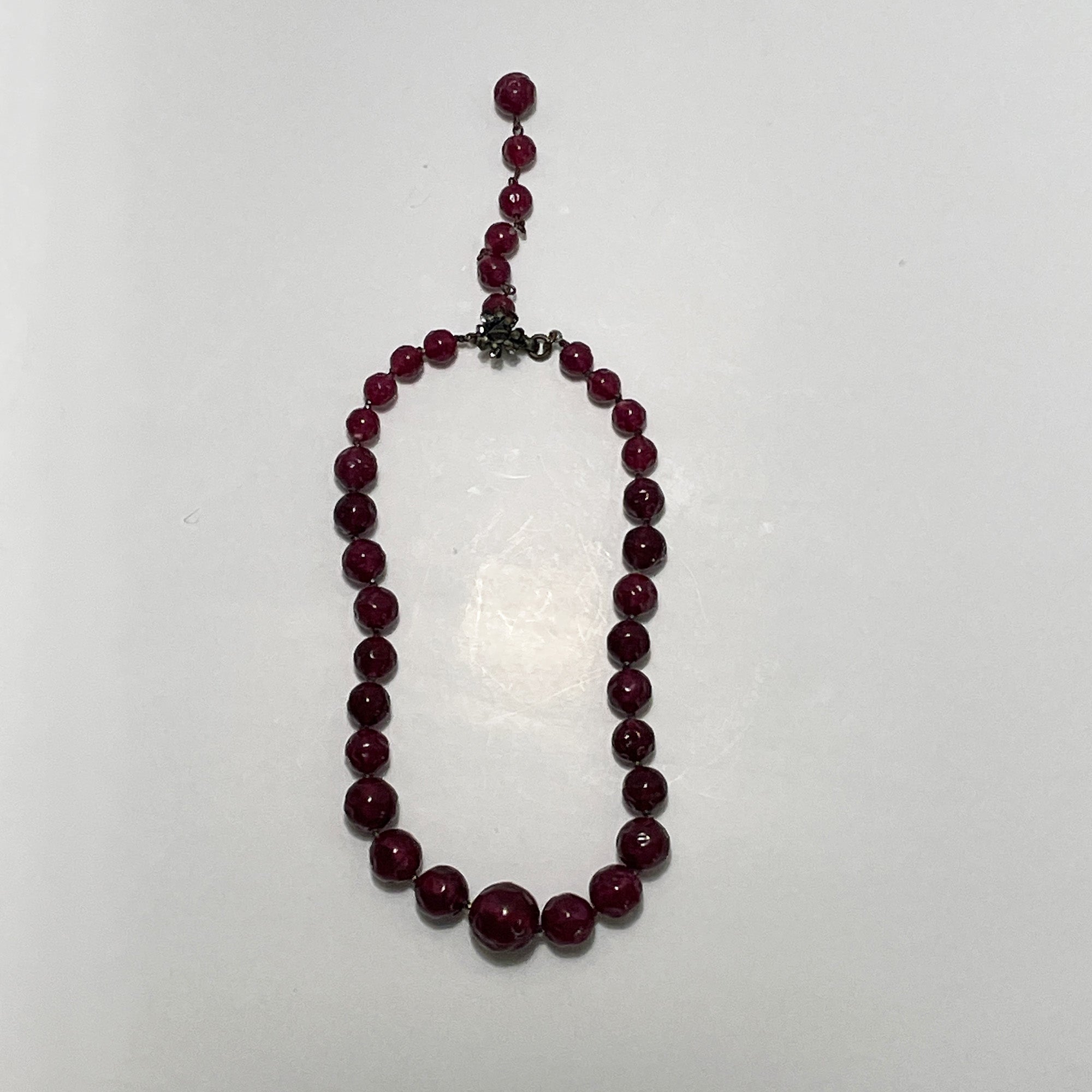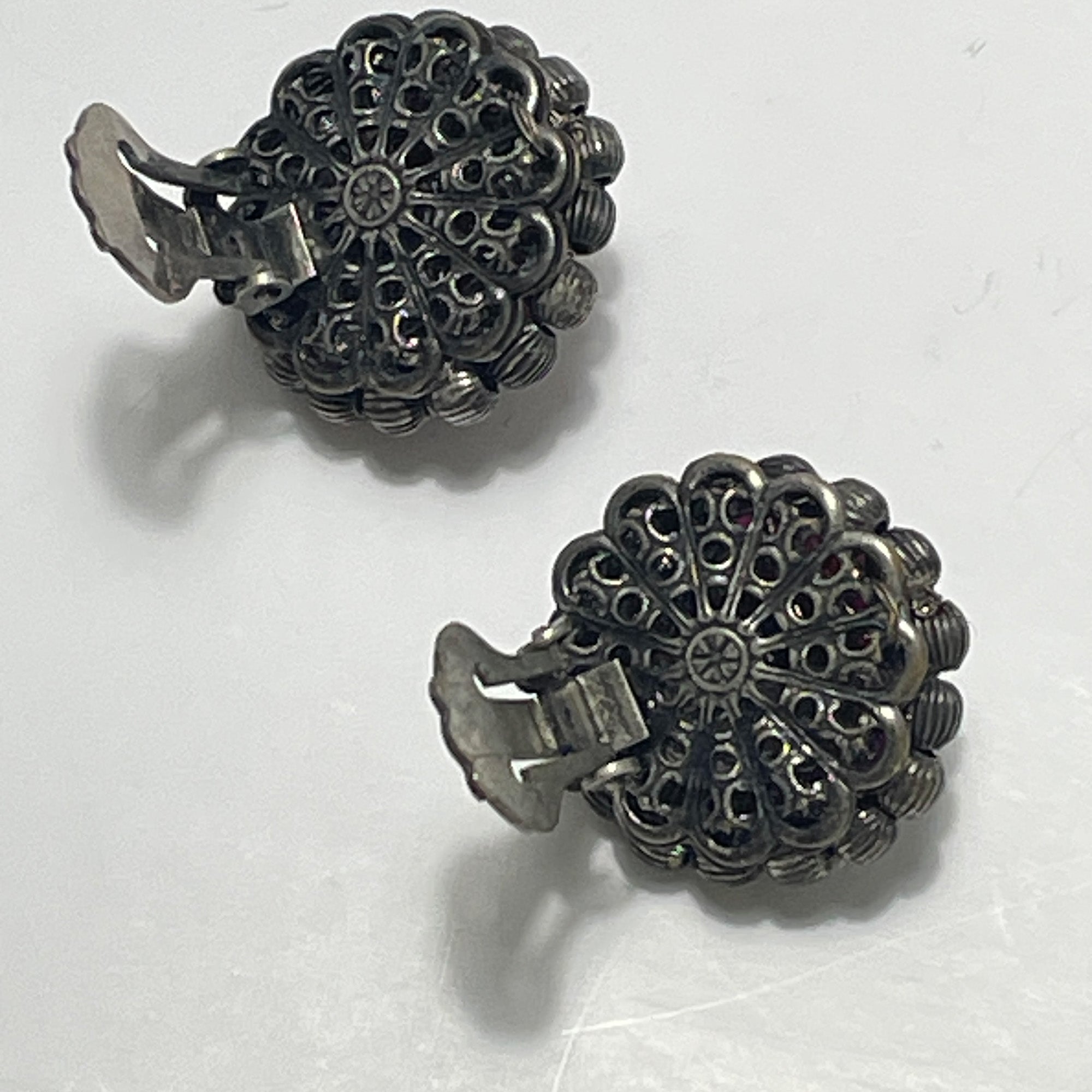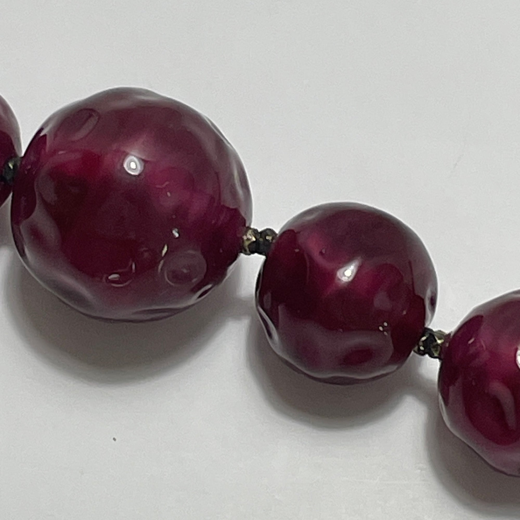 This stunning Miriam Haskell choker style necklace is strung in graduated plum colored poured glass beads. The hook clasp is decorated with intricate metal work. The earrings have the same gripoix beads with intricate metal work surrounding the bead.