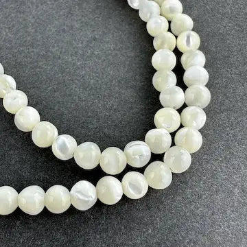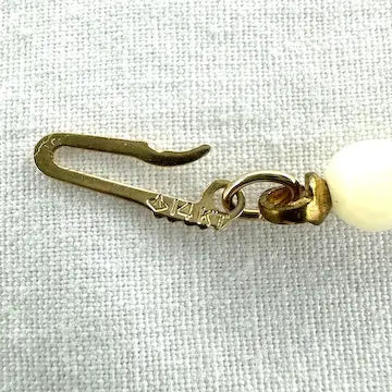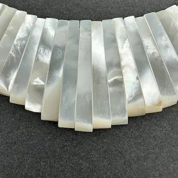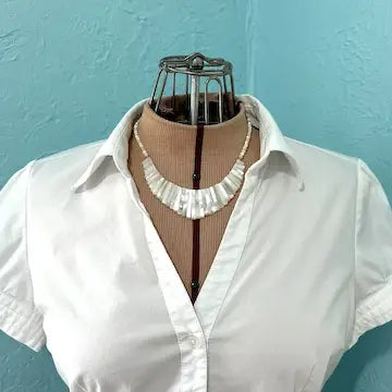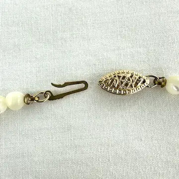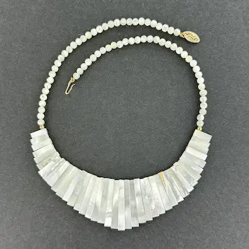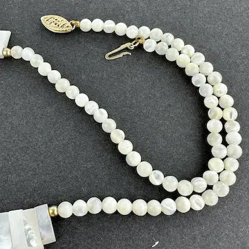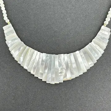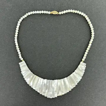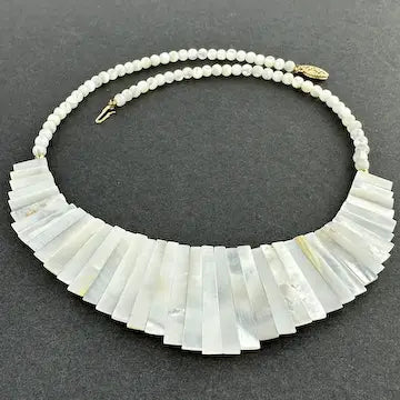 This elegant bib necklace features graduated strips of Mother of Pearl beads and a 14K gold clasp. The luxurious Mother of Pearl adds a touch of sophistication to any outfit, while the sturdy 14K gold clasp ensures its durability and longevity. Complete with a maker's mark, this necklace is a timeless addition to your jewelry collection.