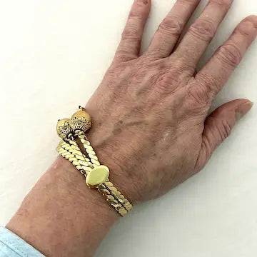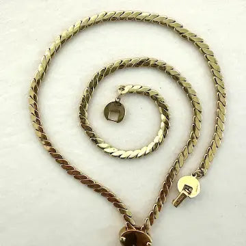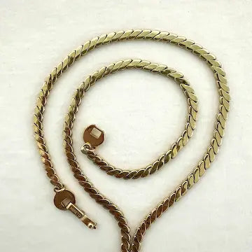 The set is in great vintage condition. There is wear to the finish on the tiny button that is on top of the bracelet’s fold over clasp. Other than that the finish is in great condition. The slides on both the necklace and bracelet work smoothly.