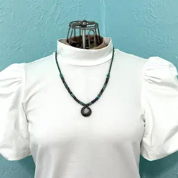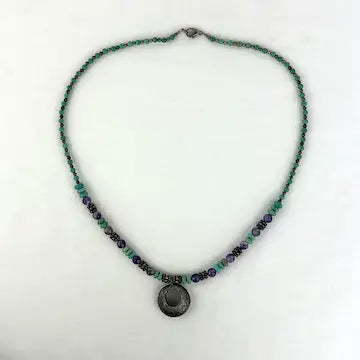 This vintage necklace features a stunning combination of sterling silver, turquoise, and amethyst beads. The delicate silver disk pendant showcases intricate engraved detailing, adding a touch of elegance to the piece. A must-have for any jewelry collection, this necklace effortlessly combines vintage charm with modern style.