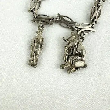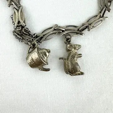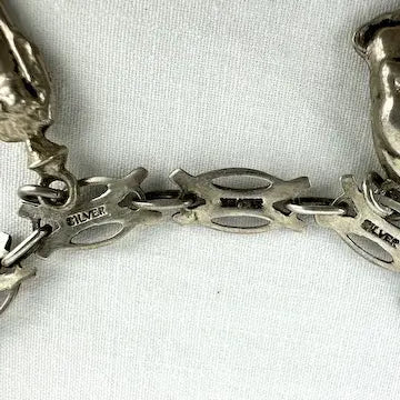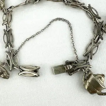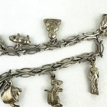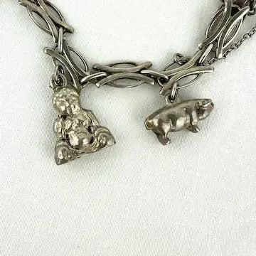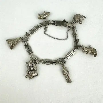 This vintage sterling silver charm bracelet features unique links and includes seven charming solid silver charms, including a pig, Buddha, cow, soldier, mouse, and teapot. The box clasp and safety chain provide added security. Add a touch of timeless elegance to your jewelry collection with this one-of-a-kind piece.