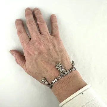 The bracelet is 6.5” in length which is a little on the small side. It weighs 28 grams. This is heavy for a 7 charm bracelet. Its weight comes from both the size of the links and the fact that the charms are solid.