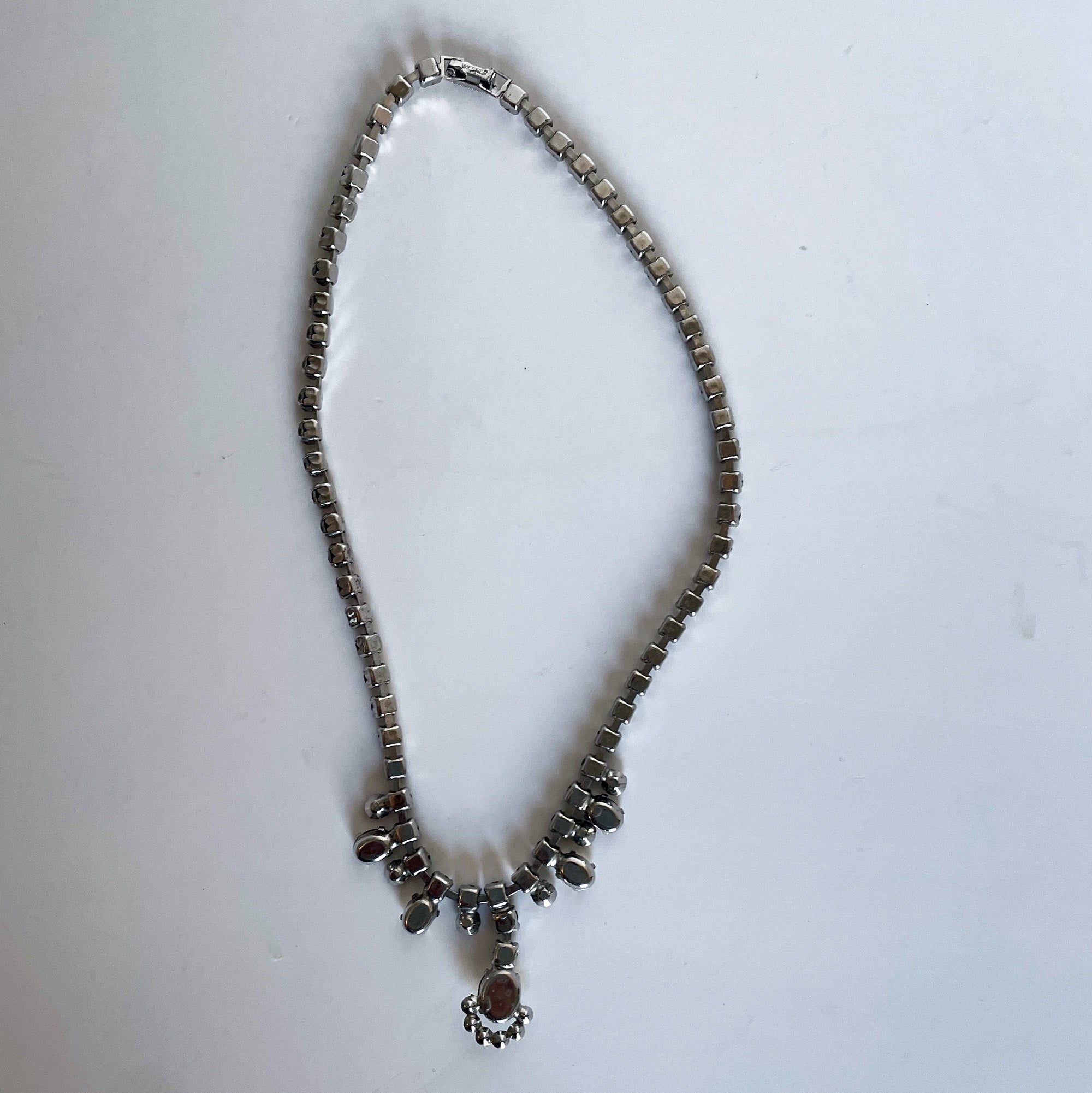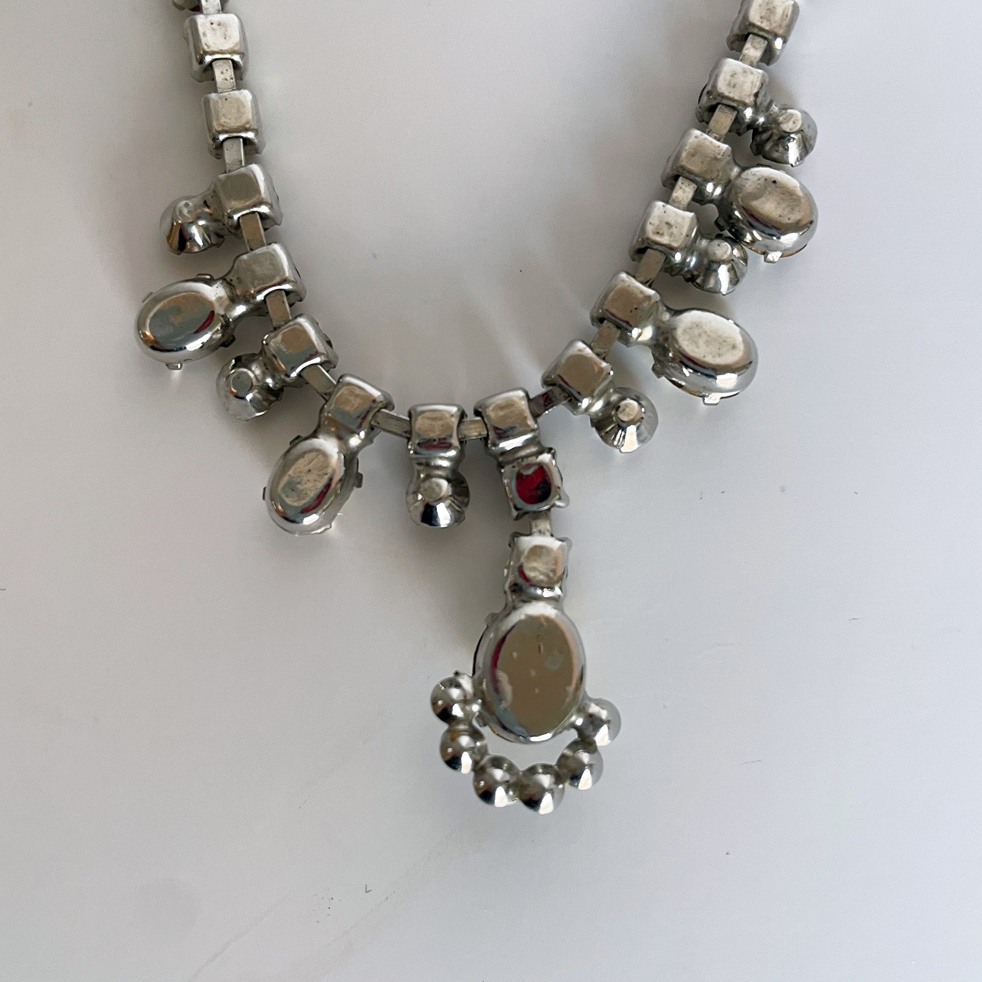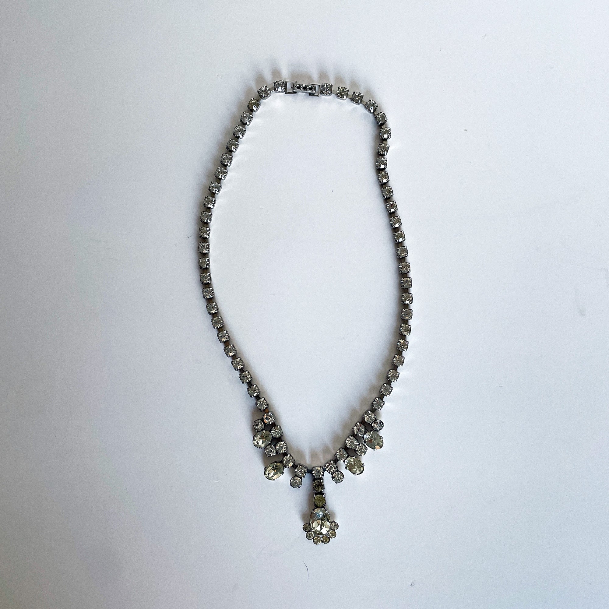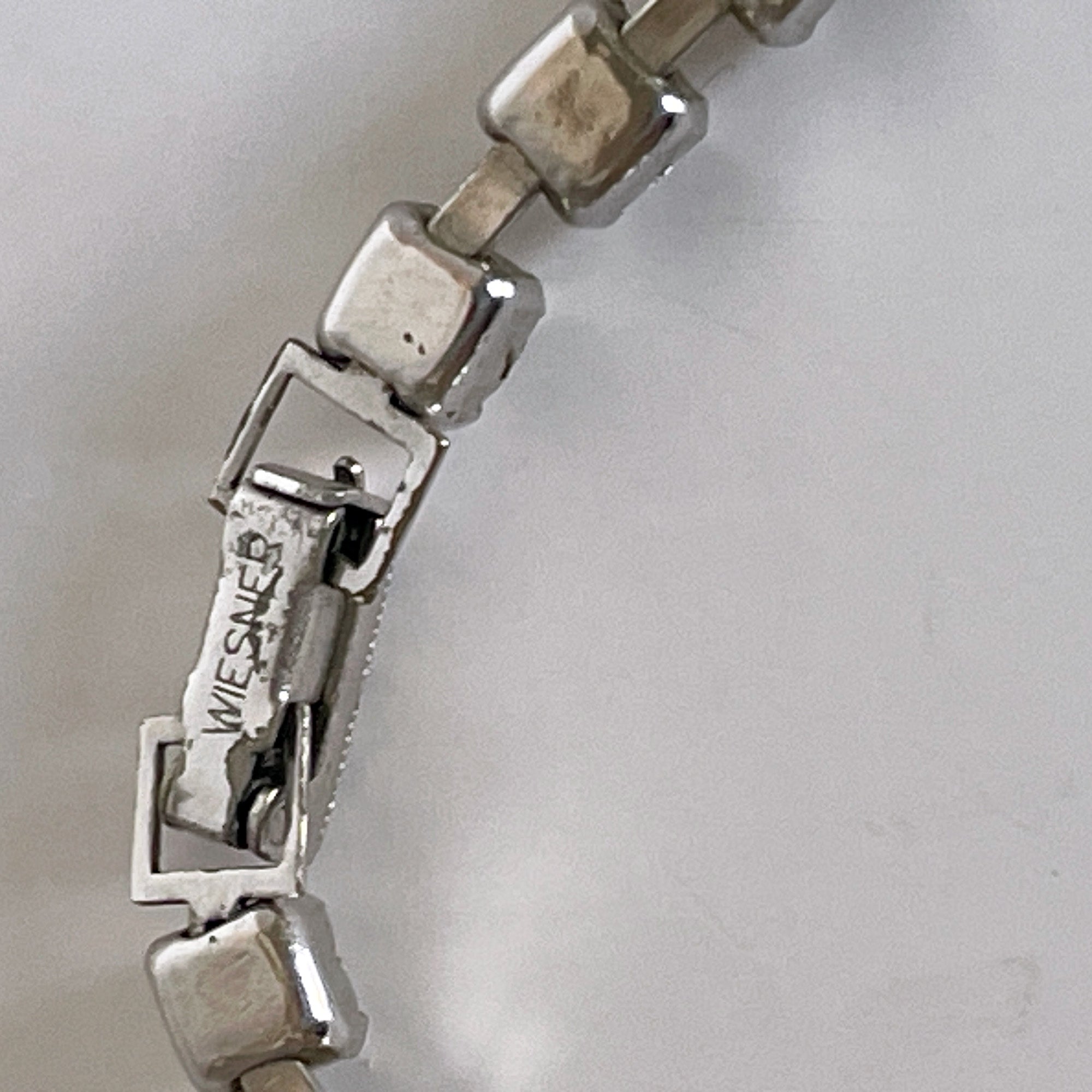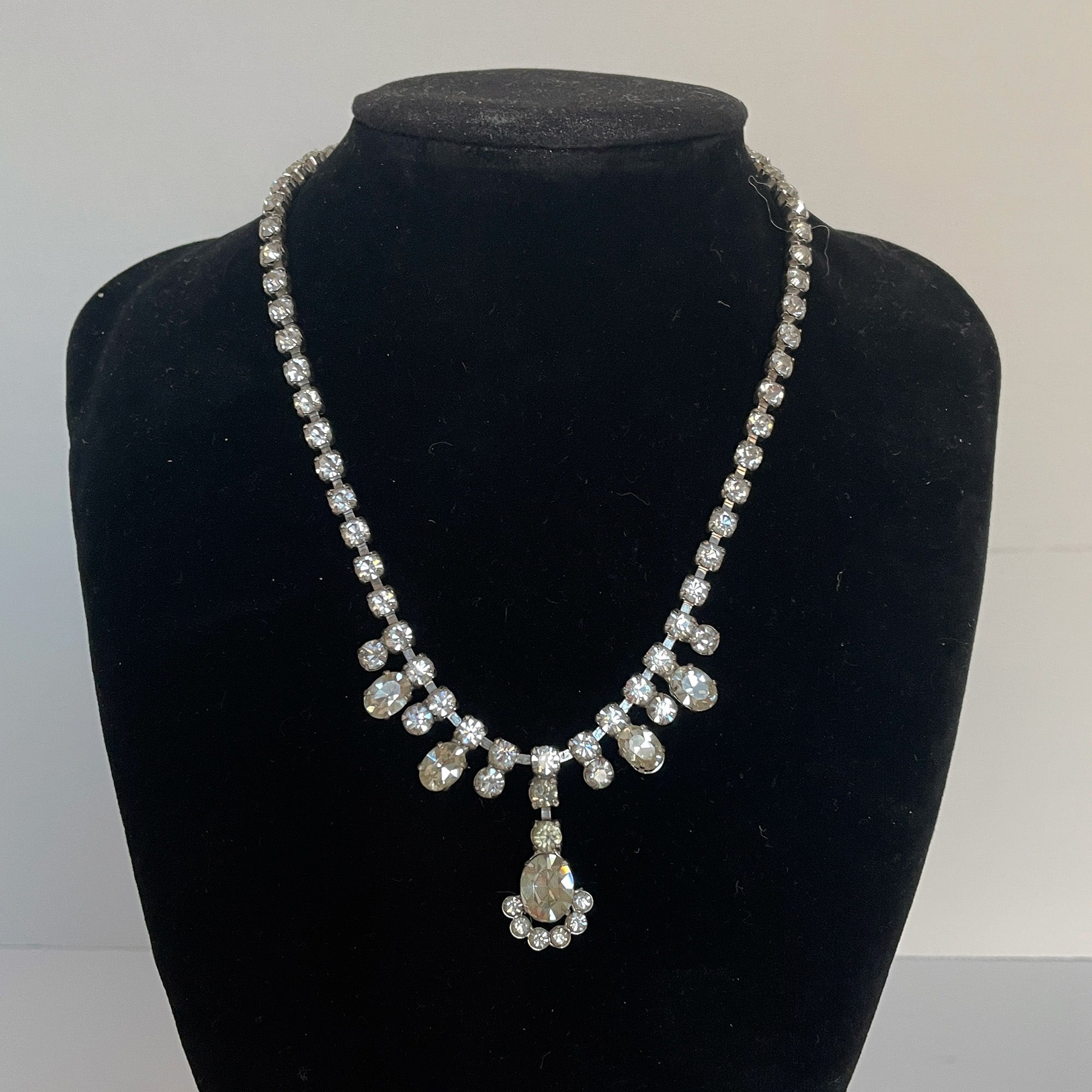 This is a beautiful clear rhinestone choker necklace with pendant by Joseph Wiesner. It was made in the 1940’s. It is mostly round cut rhinestones with drop down oval cut rhinestones. It is finished with a fold over clasp signed Wiesner on the back.