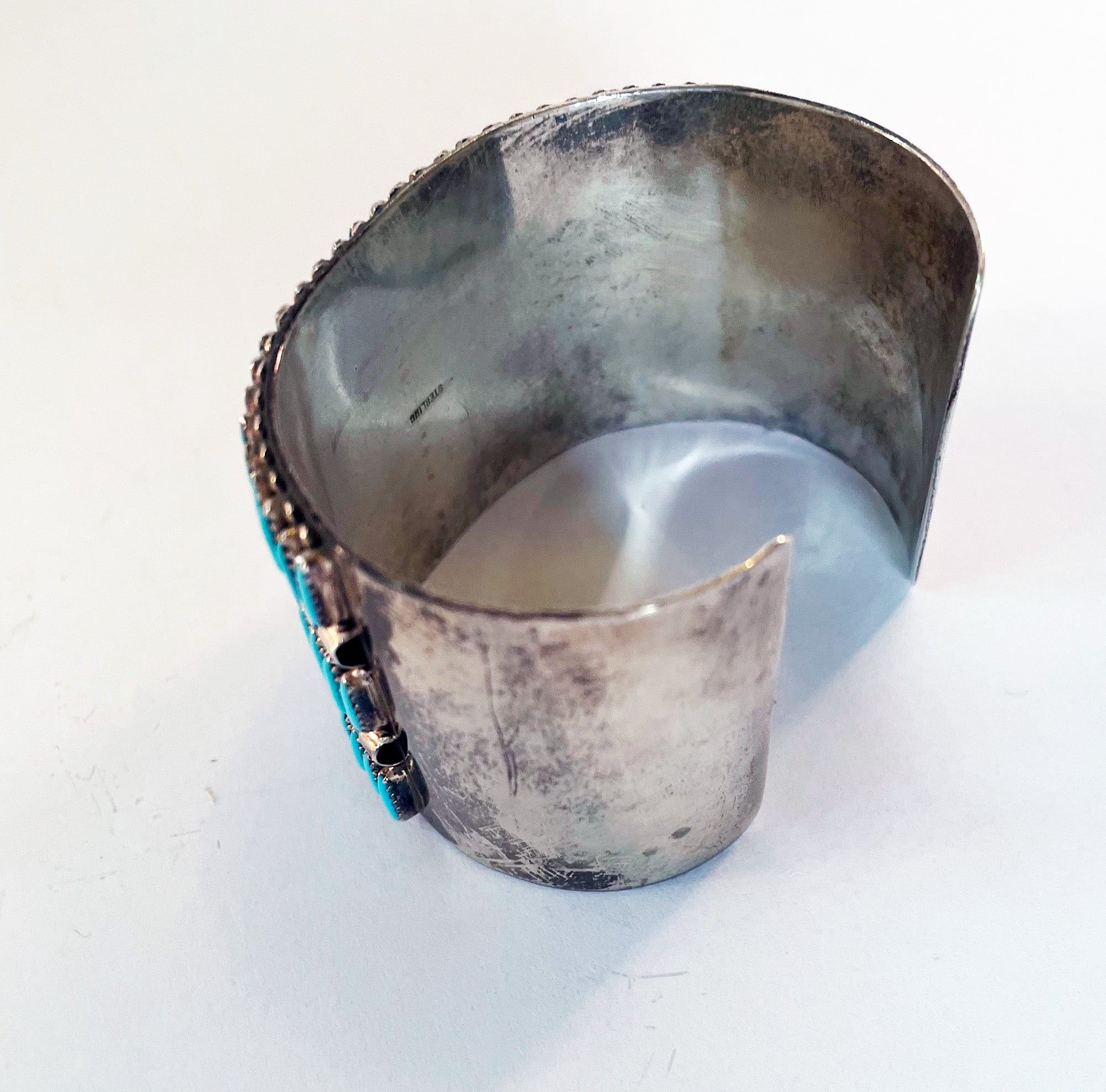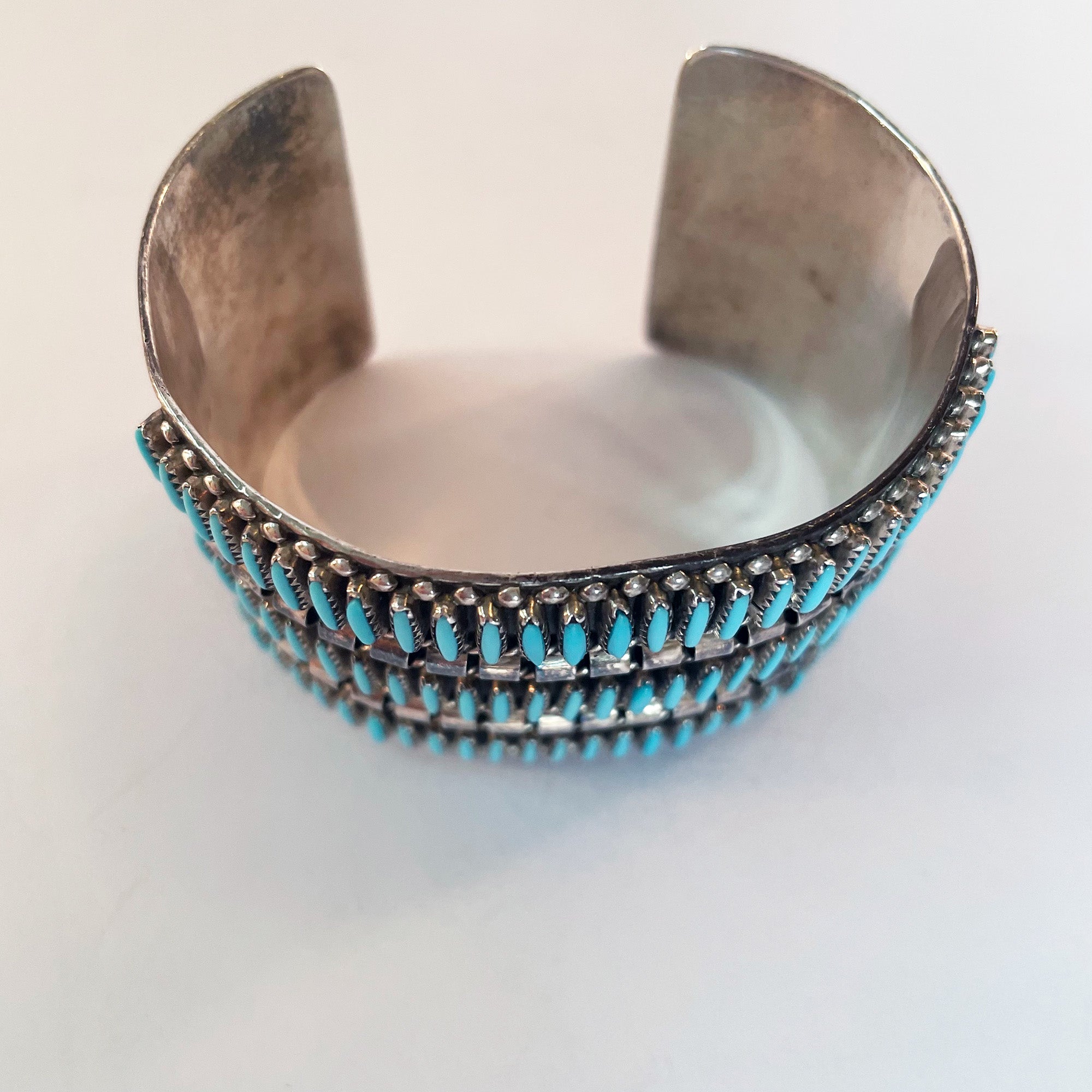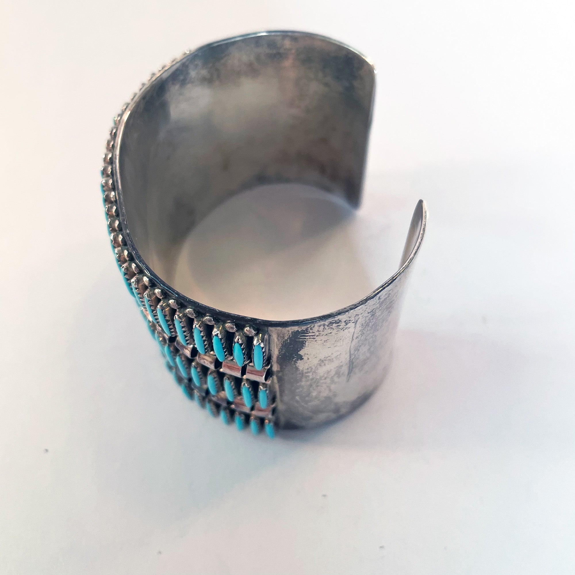 Stunning vintage Zuni cuff bracelet. It has three rows of needlepoint turquoise and is made of sterling silver.