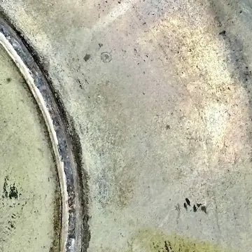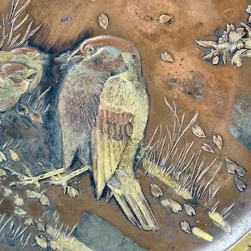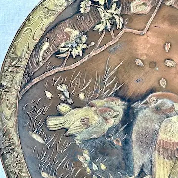 This antique Japanese calling card tray from the early 1900s features a charming round design with a mother bird feeding her babies in a beautiful botanical setting. Made of spelter with intricate repousse detailing, this tray is a unique and elegant addition to any collection.