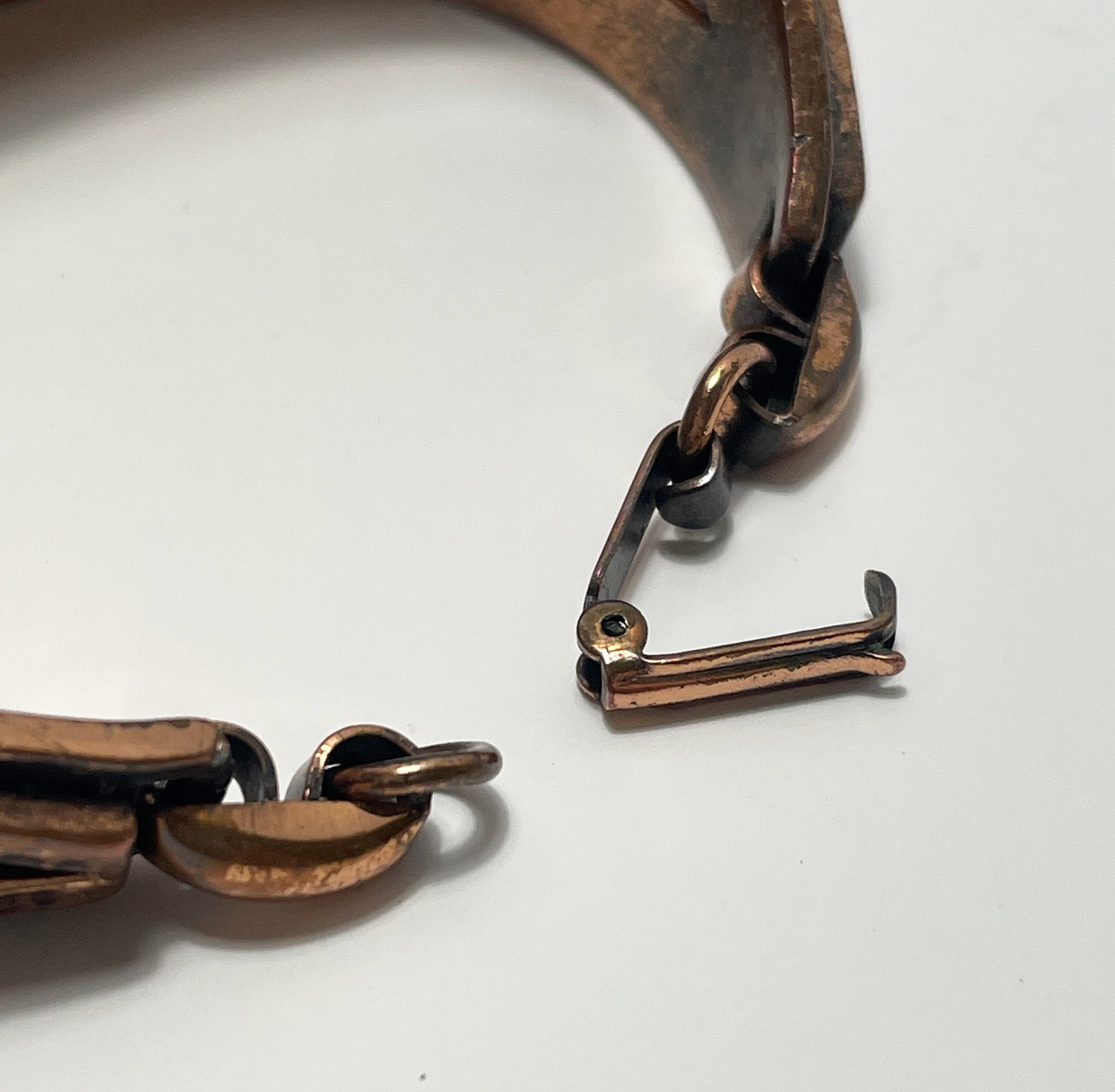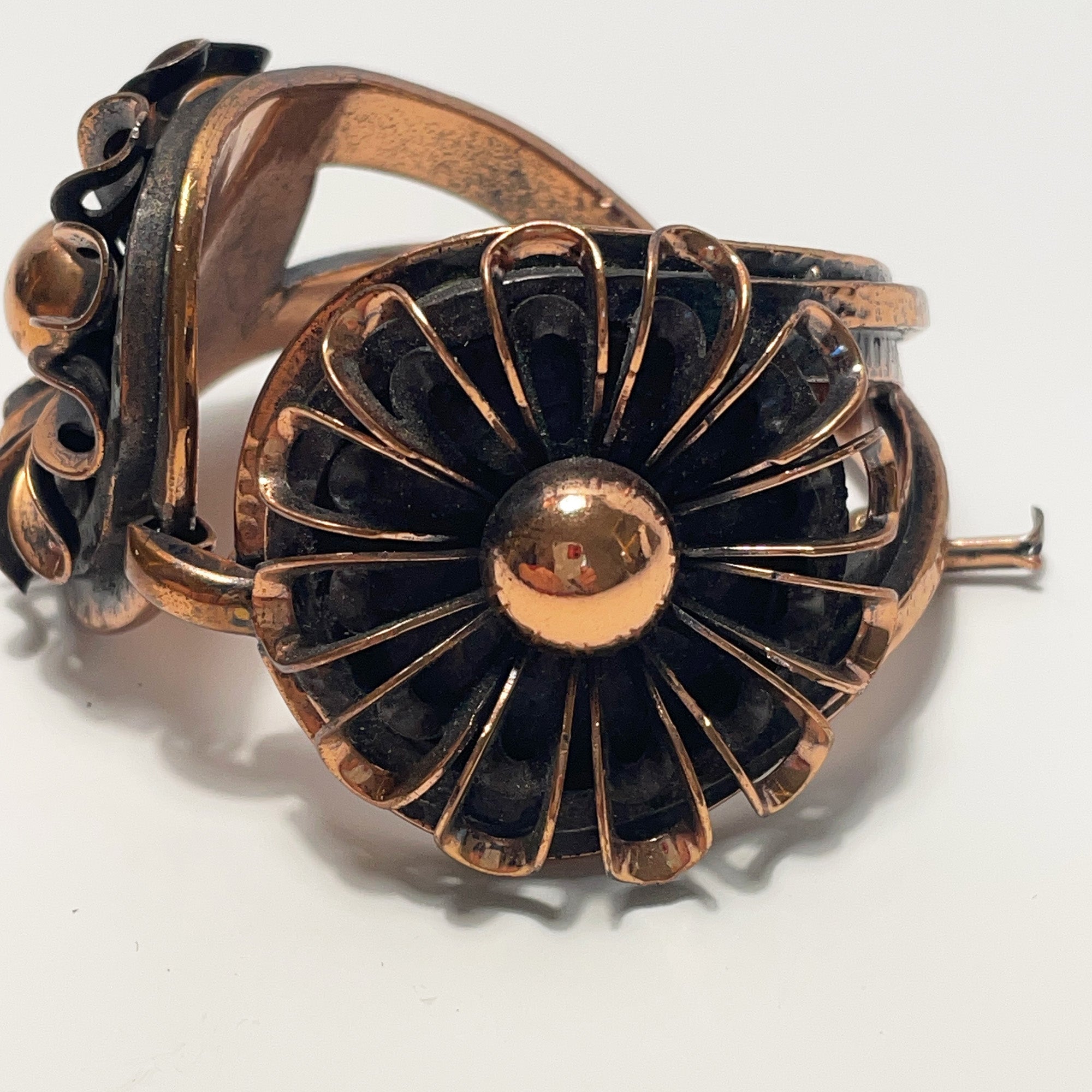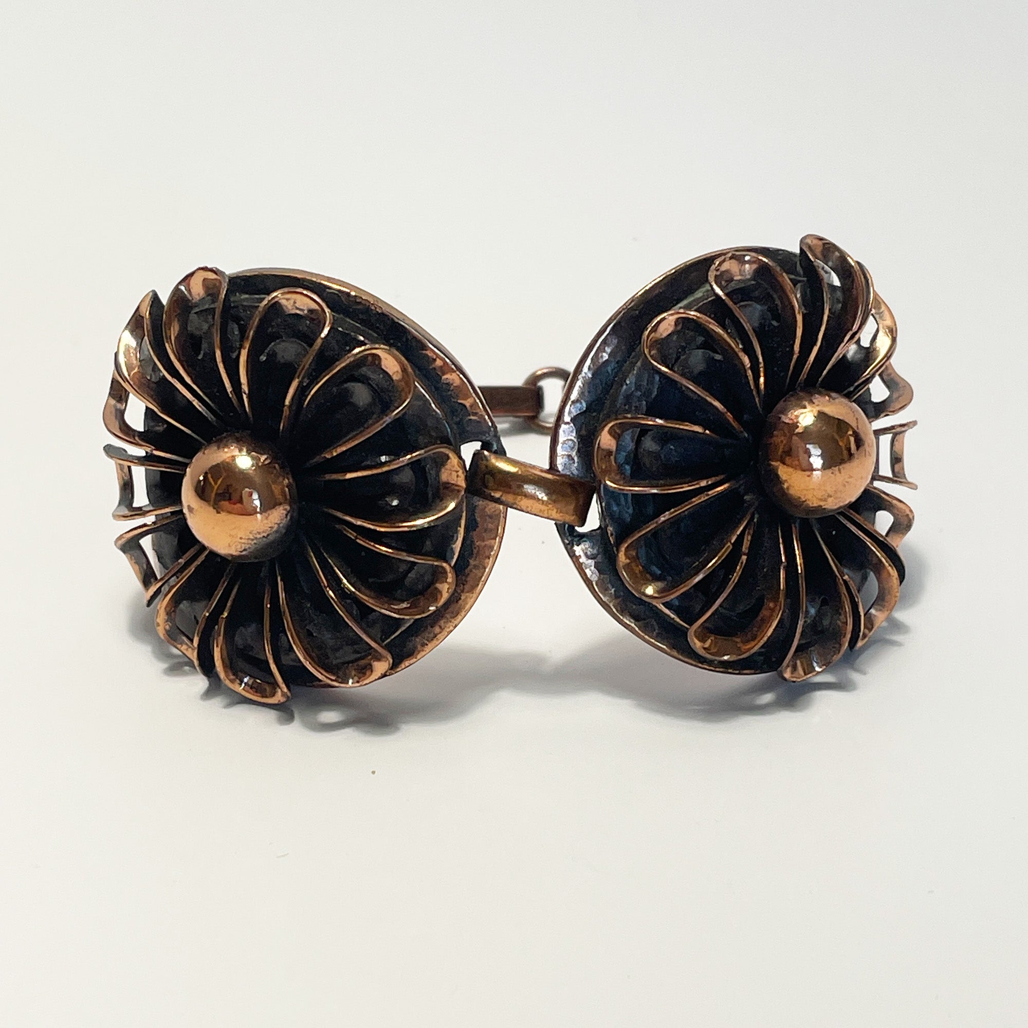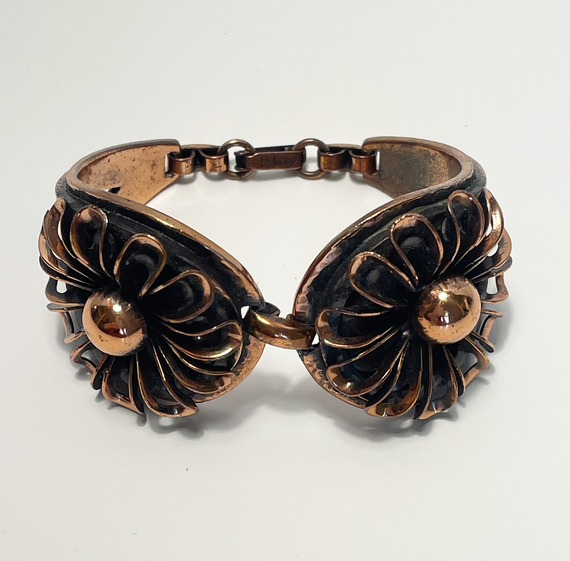 This fantastic floral design bracelet is made of copper and designed by Frank Rebajes, a well known designer from the Dominican Republic/New York City. It is a high quality hand made bracelet that has some weight to it and feels great when worn. It is signed on the back and on the clasp.