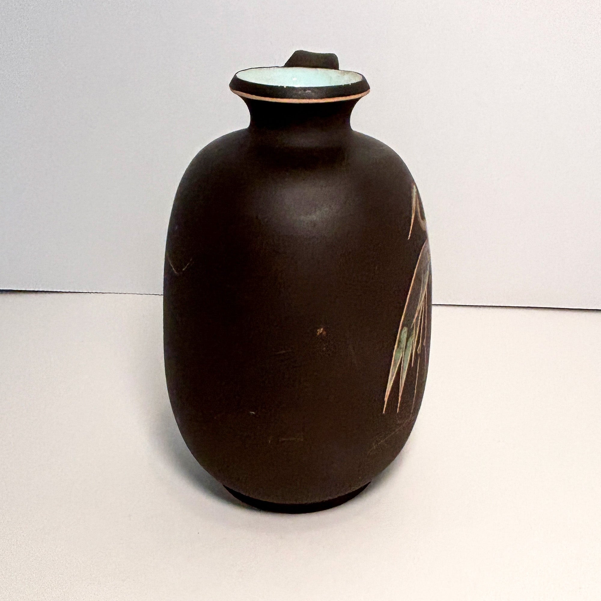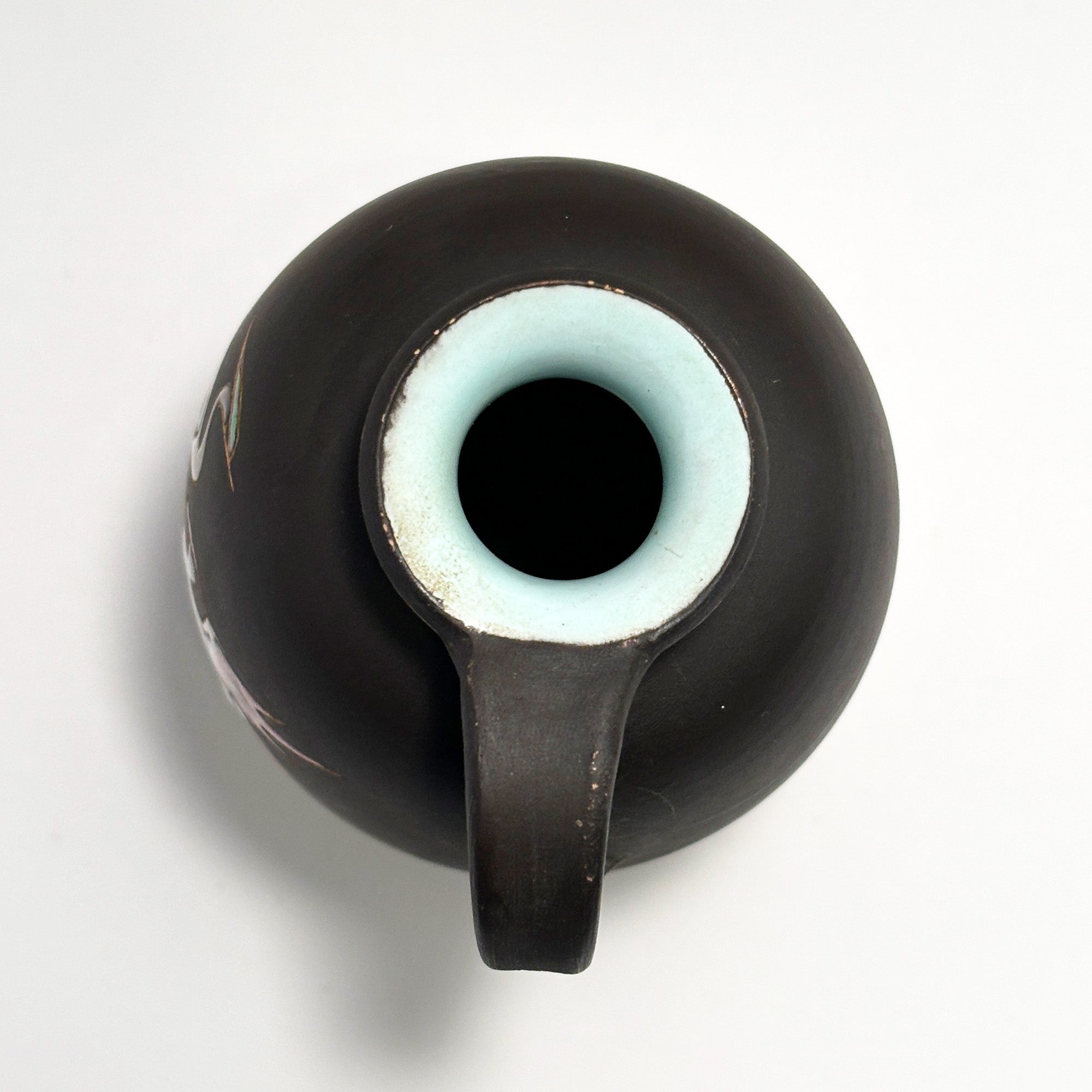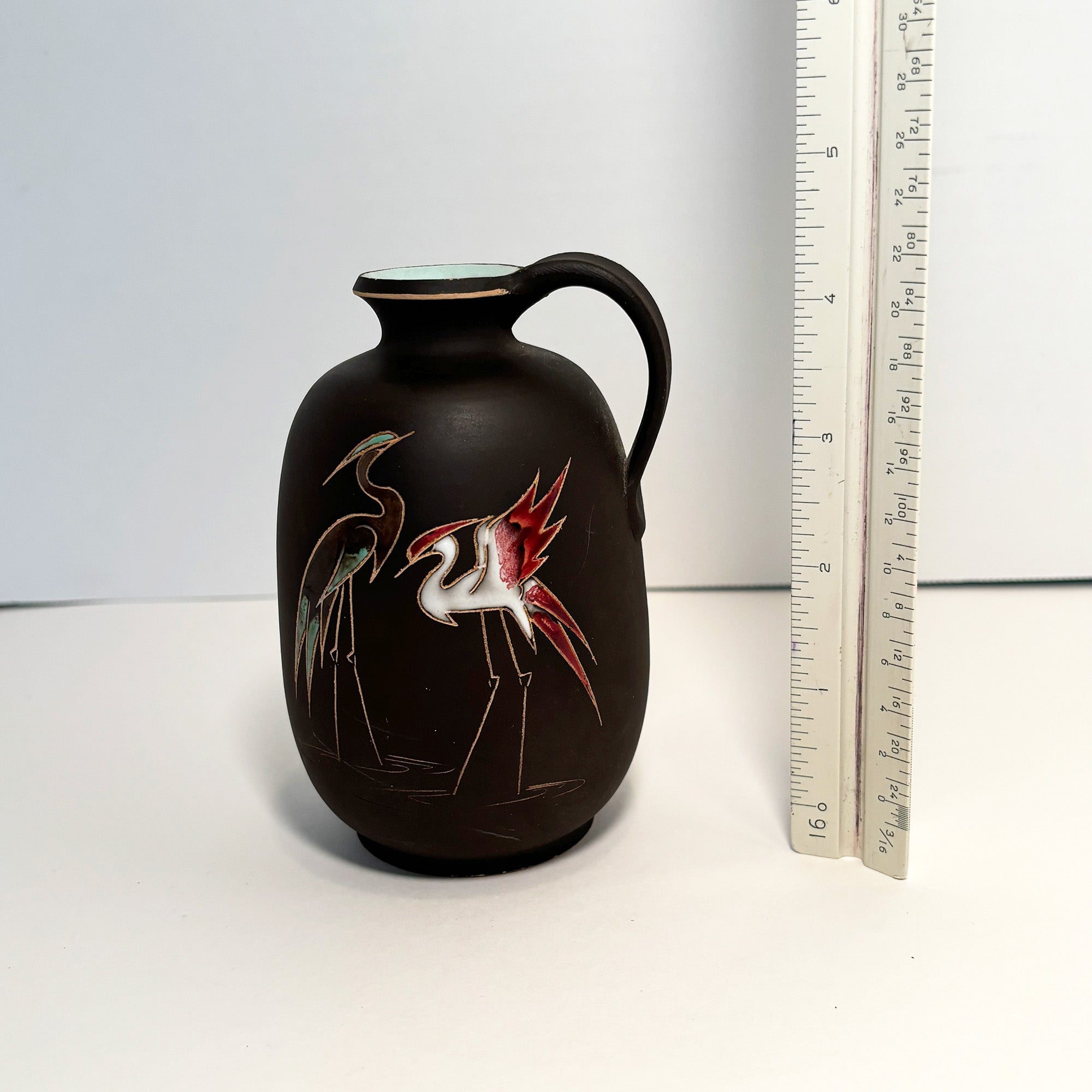 This German vase was created by Arno Kiechle in the 1950's. It has a matte black finish with a blue glazed interior. Herons are enameled on the side of the vase. It is signed on the bottom.