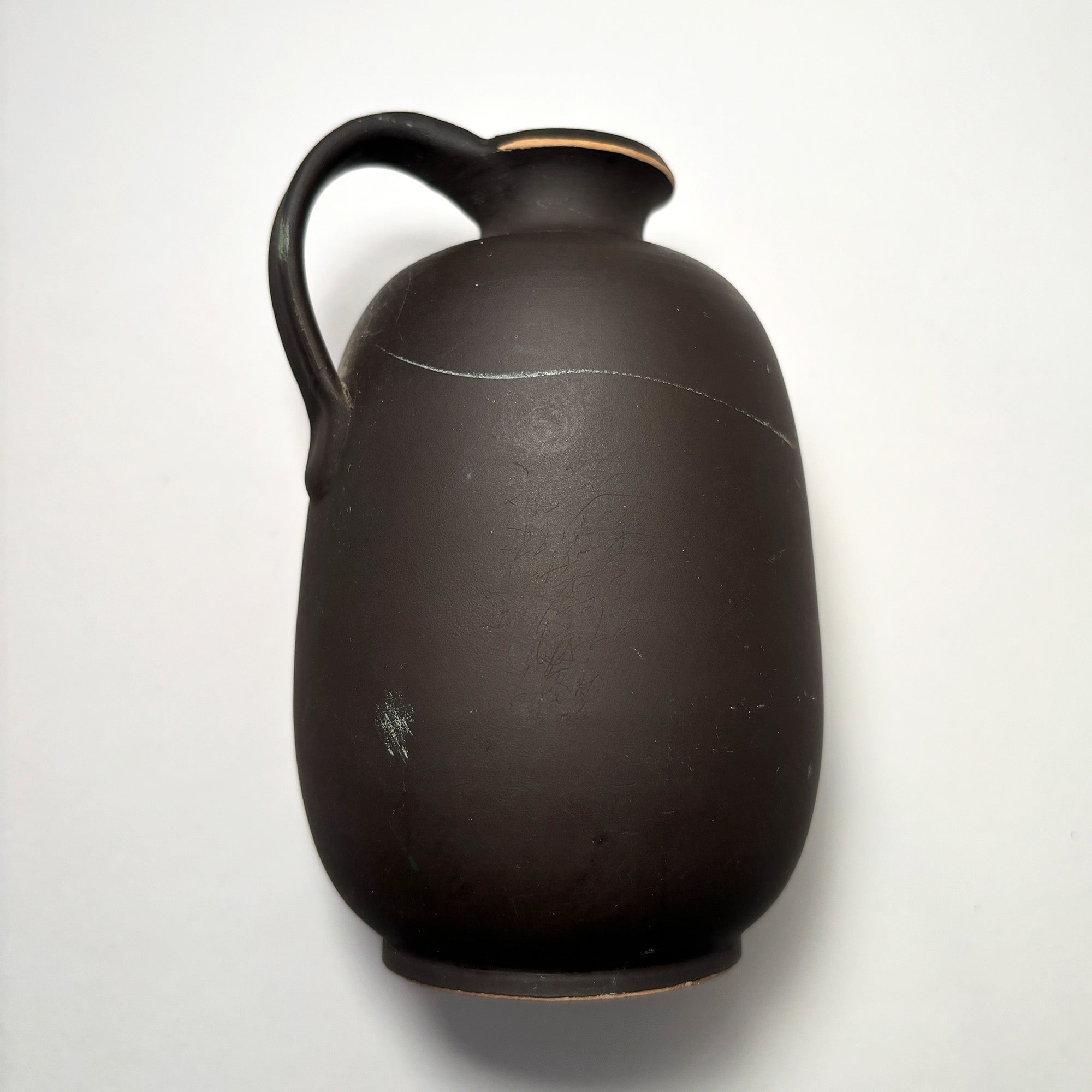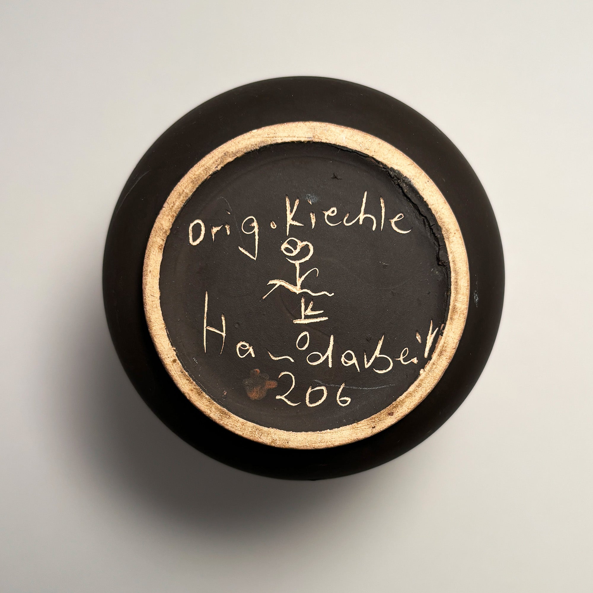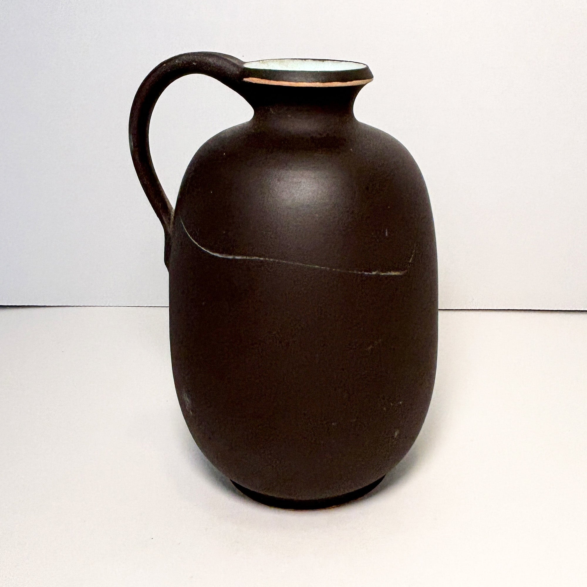This German vase was created by Arno Kiechle in the 1950's. It has a matte black finish with a blue glazed interior. Herons are enameled on the side of the vase. It is signed on the bottom.