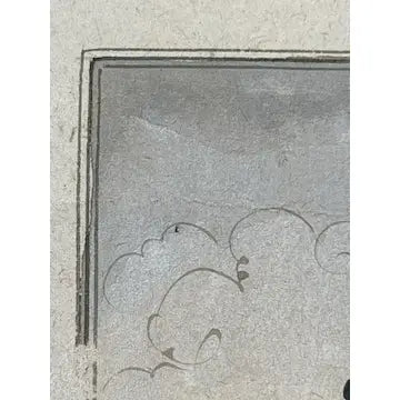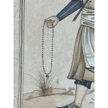 Experience the beauty of India with this hand-crafted Moghul miniature painting. Admire the intricate details and vibrant colors on vintage hand made paper, created by expert artists of the Indian school. This original painting depicts a man traveling by foot, carrying with a long necklace and surrounded by a delicate floral border.