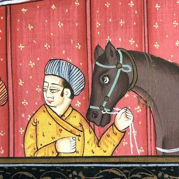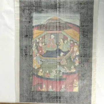 Immerse yourself in the rich history and culture of India with our vintage Moghul miniature painting. This exquisite court scene, painted on silk using gouache, captures the grandeur and opulence of a feast. Its intricate details and vintage charm make it a must-have for art lovers. Unframed for a truly authentic experience.
