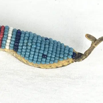 This is a Northern Plains Tribe, probably Lakota, beaded snake amulet from early 20th century. Materials include leather, blue, white and red glass beads, long metal crimped beads and stuffed with a fibrous material. It is an umbilical cord animal fetish which would have been made for a specific baby. His or her umbilical cord would have been saved and sewn into the body of the amulet and stayed with the child as protection during its entire lifetime. This is an excellent addition to any Native American collection.