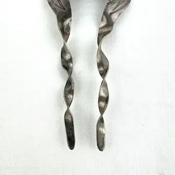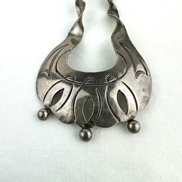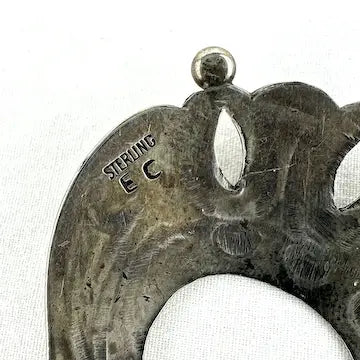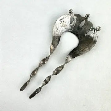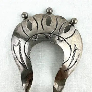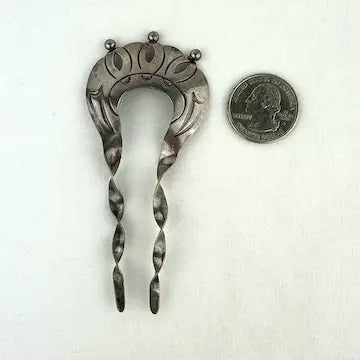 This vintage hair comb, crafted by Native American artist Eddie Chee, is a stunning example of traditional Navajo design. Made of high-quality sterling silver, this comb is delicately stamped with intricate patterns. Its versatile use and expert craftsmanship make it a beautiful and timeless accessory.