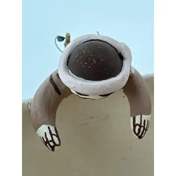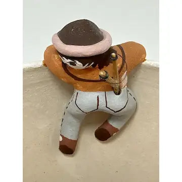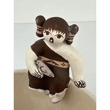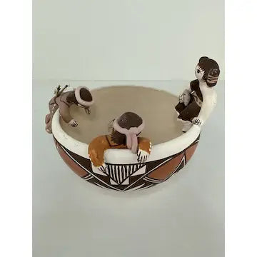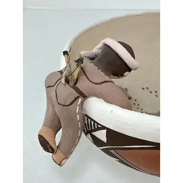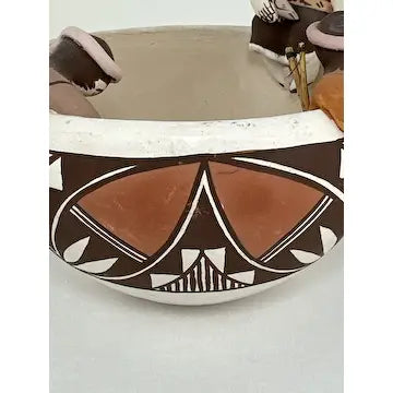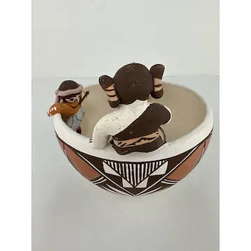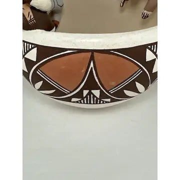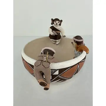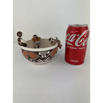 This vintage Acoma friendship bowl, crafted by 5th generation potter Marilyn Henderson, features traditional Acoma patterns and three figures crawling along the rim. Three birds on the inside symbolize friendship, while the artist's signature adds authenticity. Perfect for adding a touch of Native American culture to any space.
