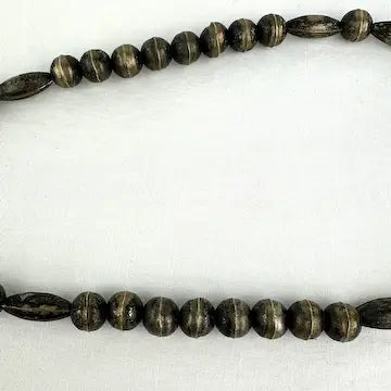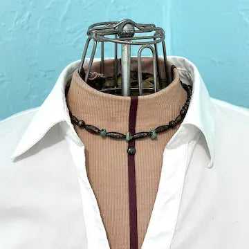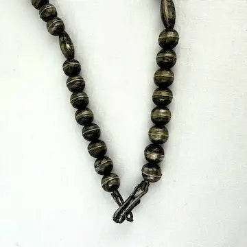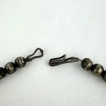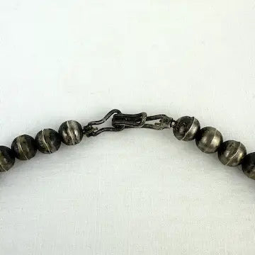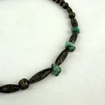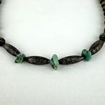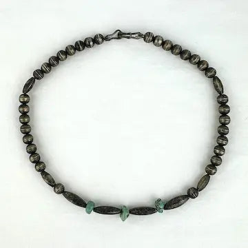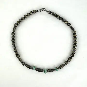 Crafted by Native American artisans, this vintage choker necklace features stunning silver pearl and turquoise nugget beads, accented with intricately detailed bench beads. The perfect addition to any jewelry collection, this necklace is strung on wire for durability and timeless style.