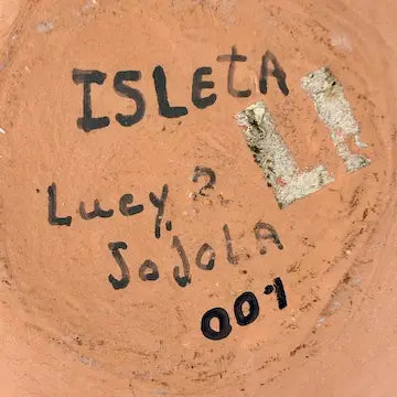 This vintage Isleta Pueblo polychrome pottery bowl, hand-crafted by renowned artist Lucy Jojola, showcases traditional coil techniques and geometric designs inspired by lighting clouds. Made with expertise and signed, this Native American piece is a unique addition to any collection.