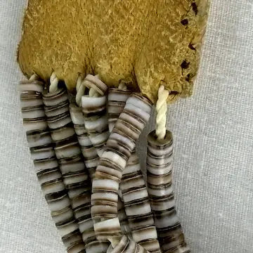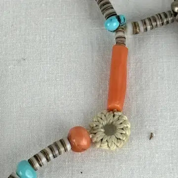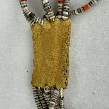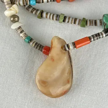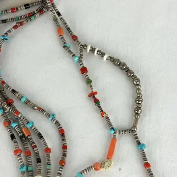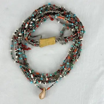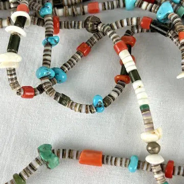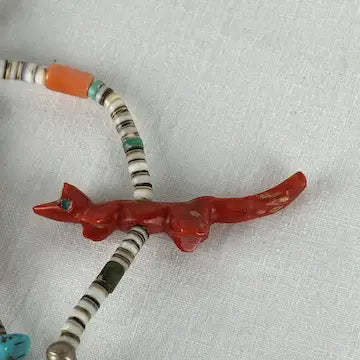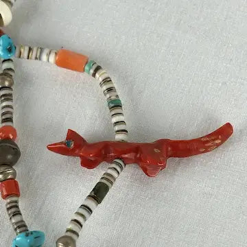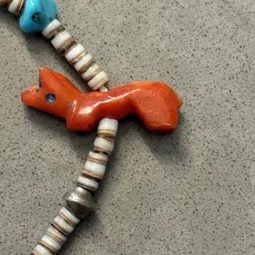 Experience the beauty and artistry of the Native American culture with our vintage seven strand Santo Domingo treasure necklace. This opera length necklace features a stunning combination of coral, turquoise, heishi, and Navajo pearl beads, accompanied by a striking spiny oyster pendant. Adorned with a fox fetish and hand-crocheted circular beads, this piece is a treasure from the 1970s. Complete with a leather closure, this vintage necklace is a must-have for any collector or jewelry enthusiast.
