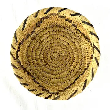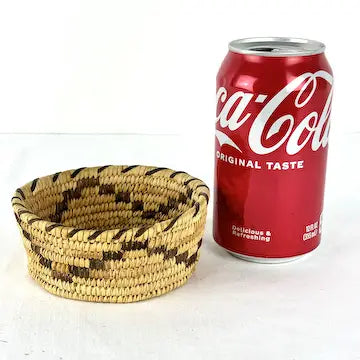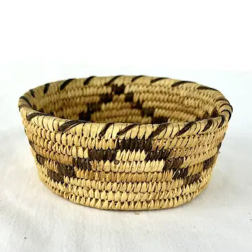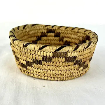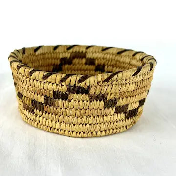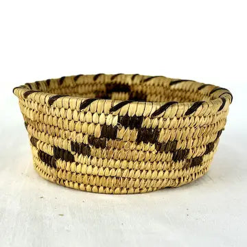 Expertly hand-woven by the Tohono Oodham tribe, this vintage Native American Papago basket is a stunning piece of craftsmanship. Made with traditional materials such as bear grass, yucca, and devil's claw, its unique zigzag pattern adds a touch of cultural heritage to any space.