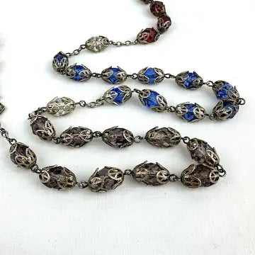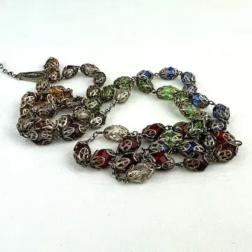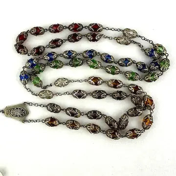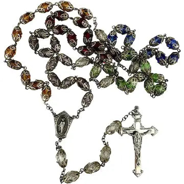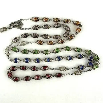 Enhance your Catholic devotion with the Diroma multicolor sterling silver rosary. This exquisite rosary features five decades of colorful glass beads, paired with a rhodium plated sterling silver crucifix. Experience the power of prayer with this expertly crafted religious accessory.