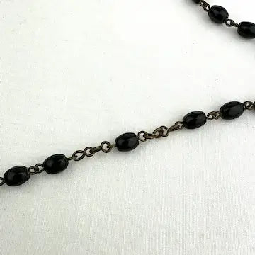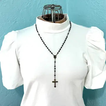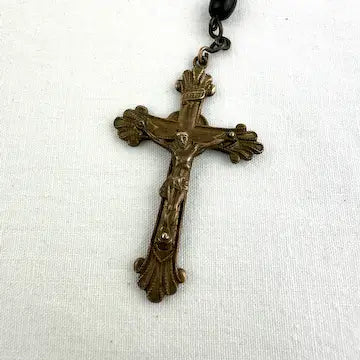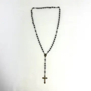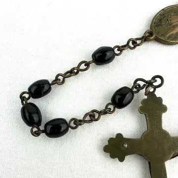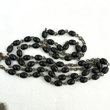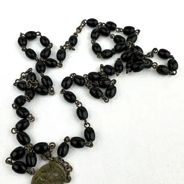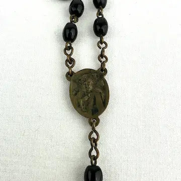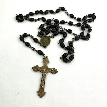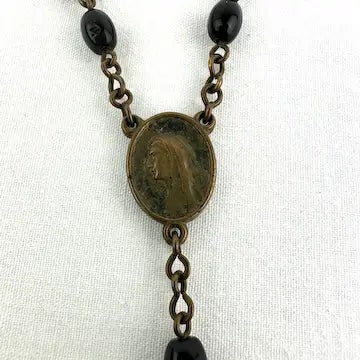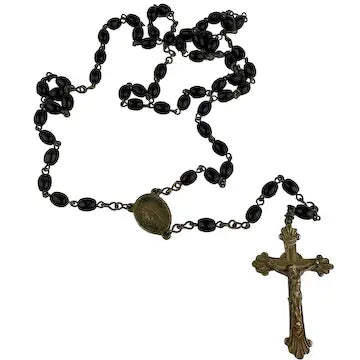 This vintage Czech black glass 5 decade rosary is a stunning piece for any Christian or Catholic individual. Each bead is crafted from high-quality glass, giving it a timeless and elegant look. The brass crucifix adds a touch of tradition and reverence to this beautiful rosary. Perfect for daily prayer and reflection.