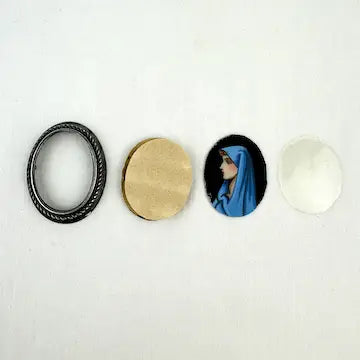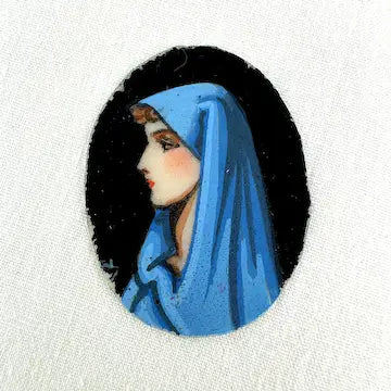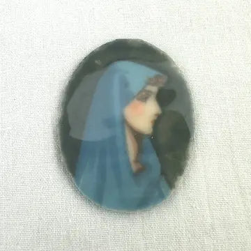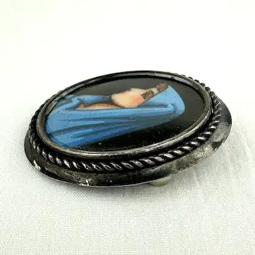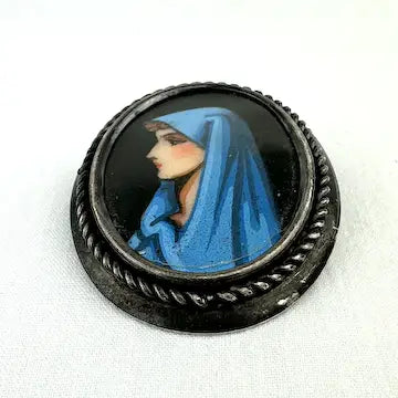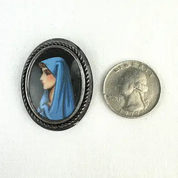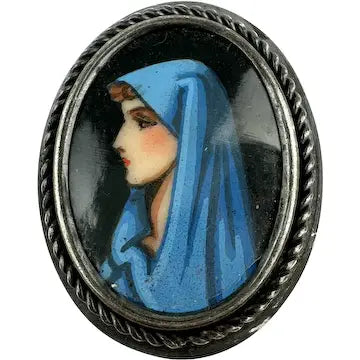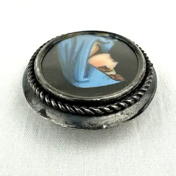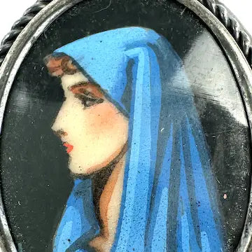 This exquisite brooch features a vintage, hand painted portrait of the Virgin Mary on celluloid. The French influence is evident in its elegant oval shape and delicate metal rope detail. A timeless and sophisticated addition to any accessory collection.