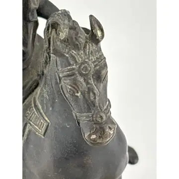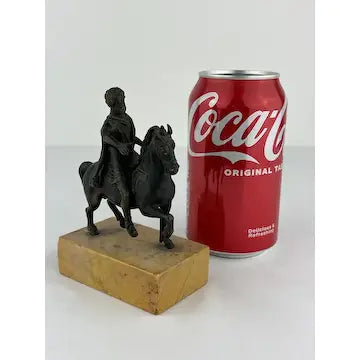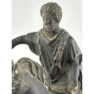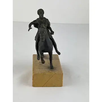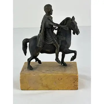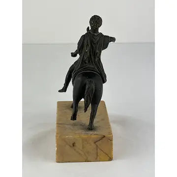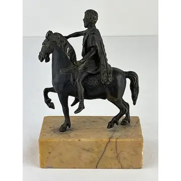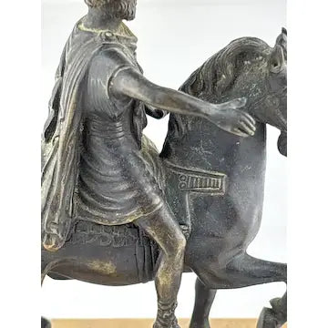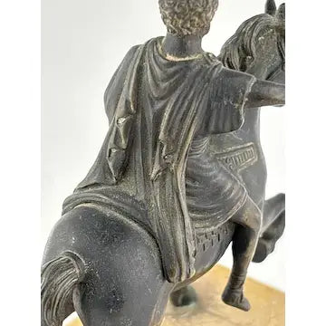 This antique patinated bronze sculpture features the historical figure of Marcus Aurelius on his horse, elegantly mounted on a block of marble. With its intricate details and rich patina, this sculpture is a true collector's item that celebrates both beauty and history.