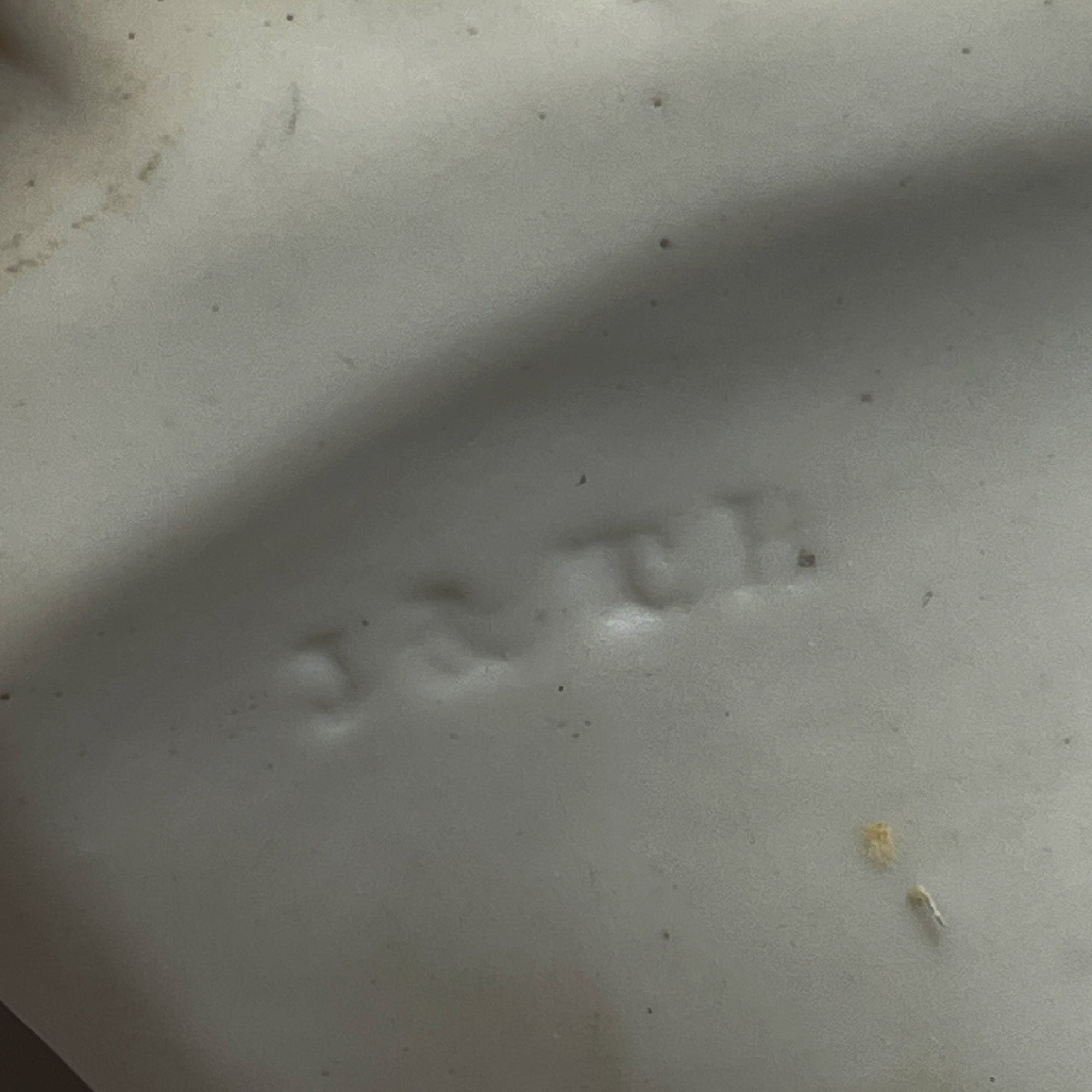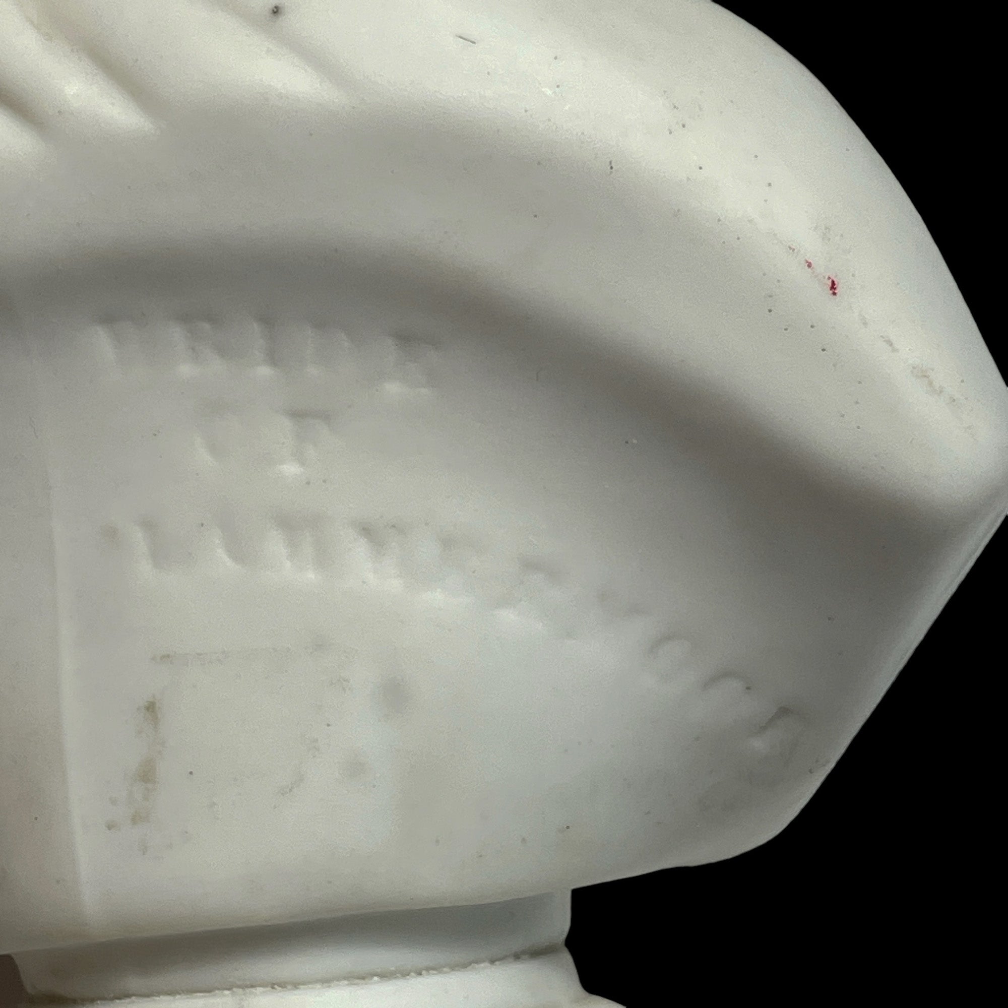 James and Thomas Bevington created this Parian bust sometime between 1865 and 1878. The Bevingtons worked in Staffordshire, England. This sculpture - “The Bride of Lammermoor” is based on the 1819 romantic tragedy written by Walter Scott. It is stamped on the back J&TB and Bride of Lammermoor.