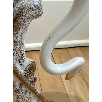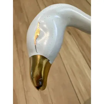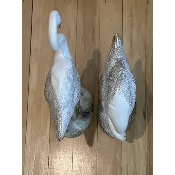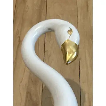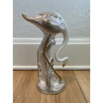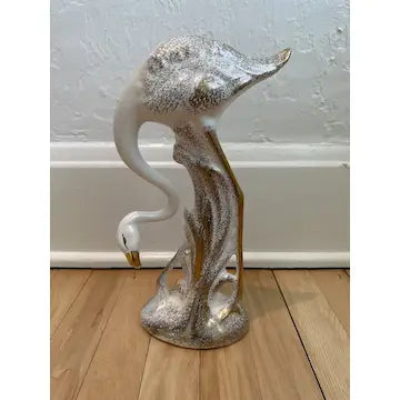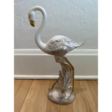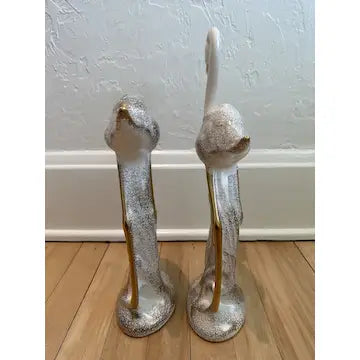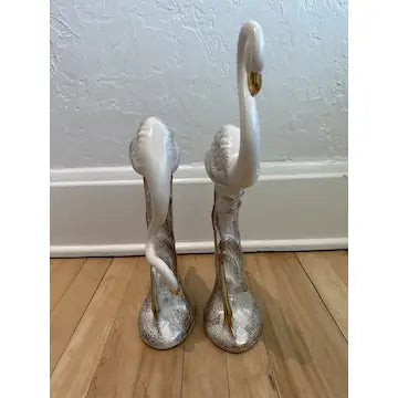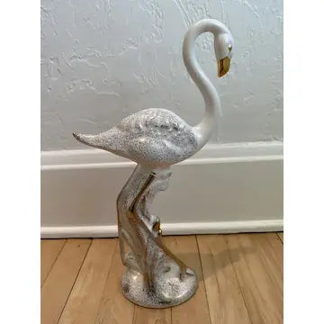 Indulge in the glamour of Hollywood Regency with these stunning vintage ceramic flamingos. Adorned with gold accents, these rare pieces will elevate any space with their unique presence. Perfect for collectors and vintage enthusiasts alike.
