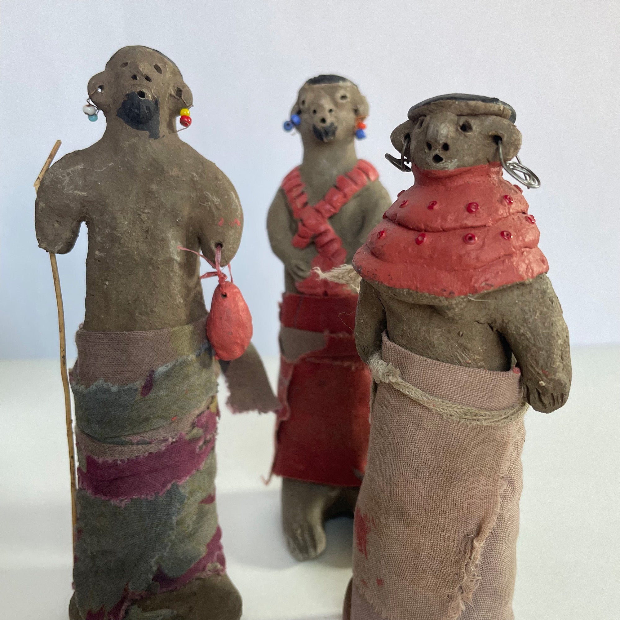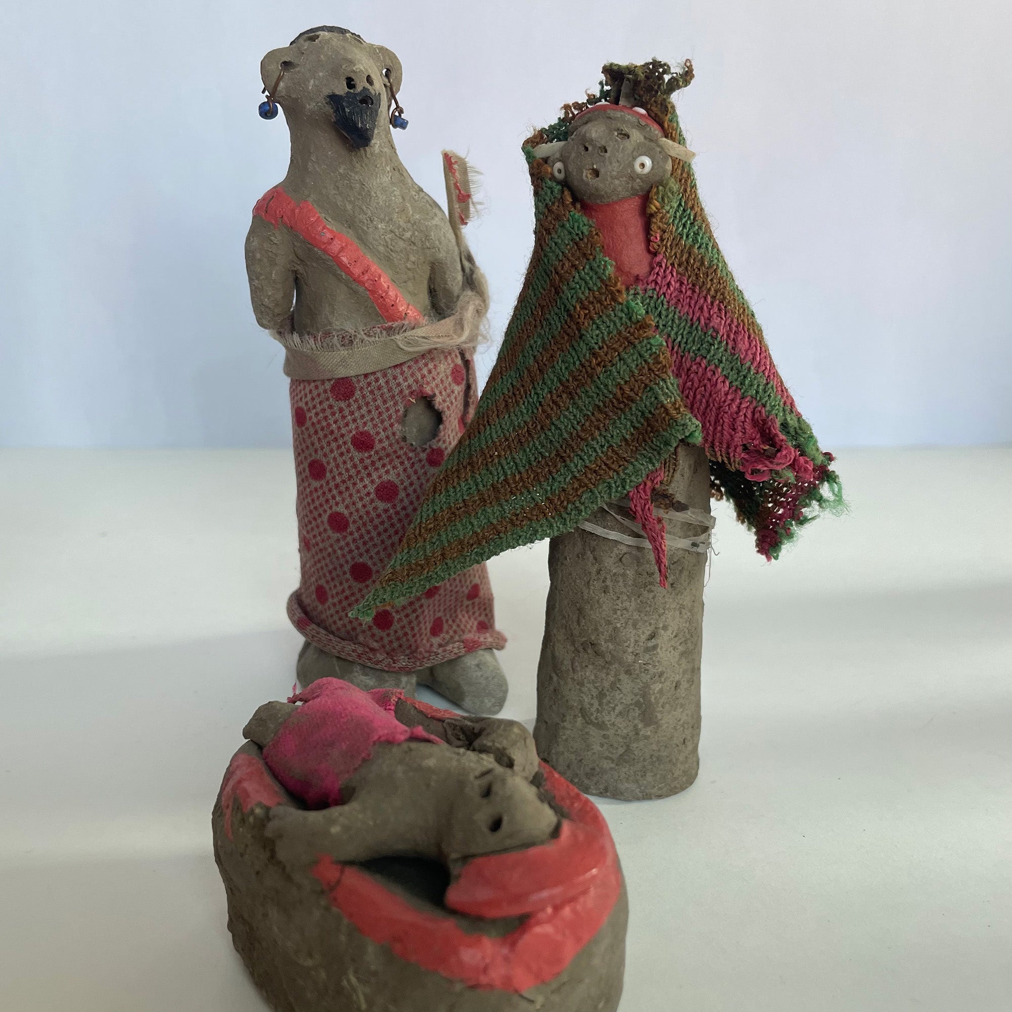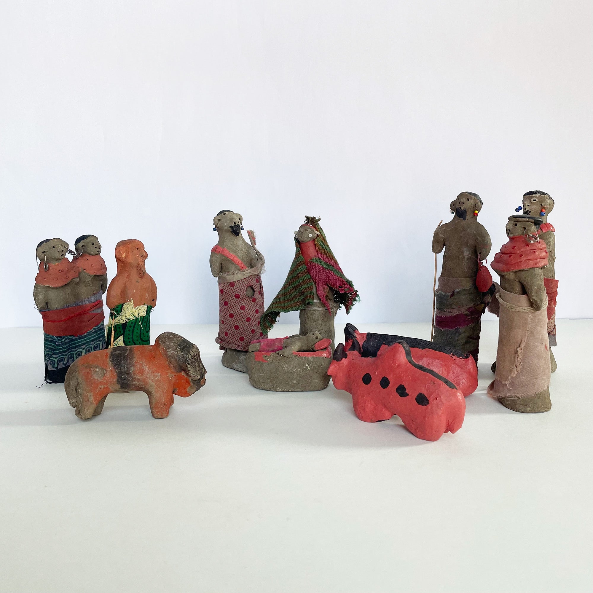African nativity scene created by the Samburu people in Kenya. This set includes 5 male figures and one double male figure. It also includes one female figure with woven shawl, a baby in a cradle, and three animals. All figures are made of clay and fabric.