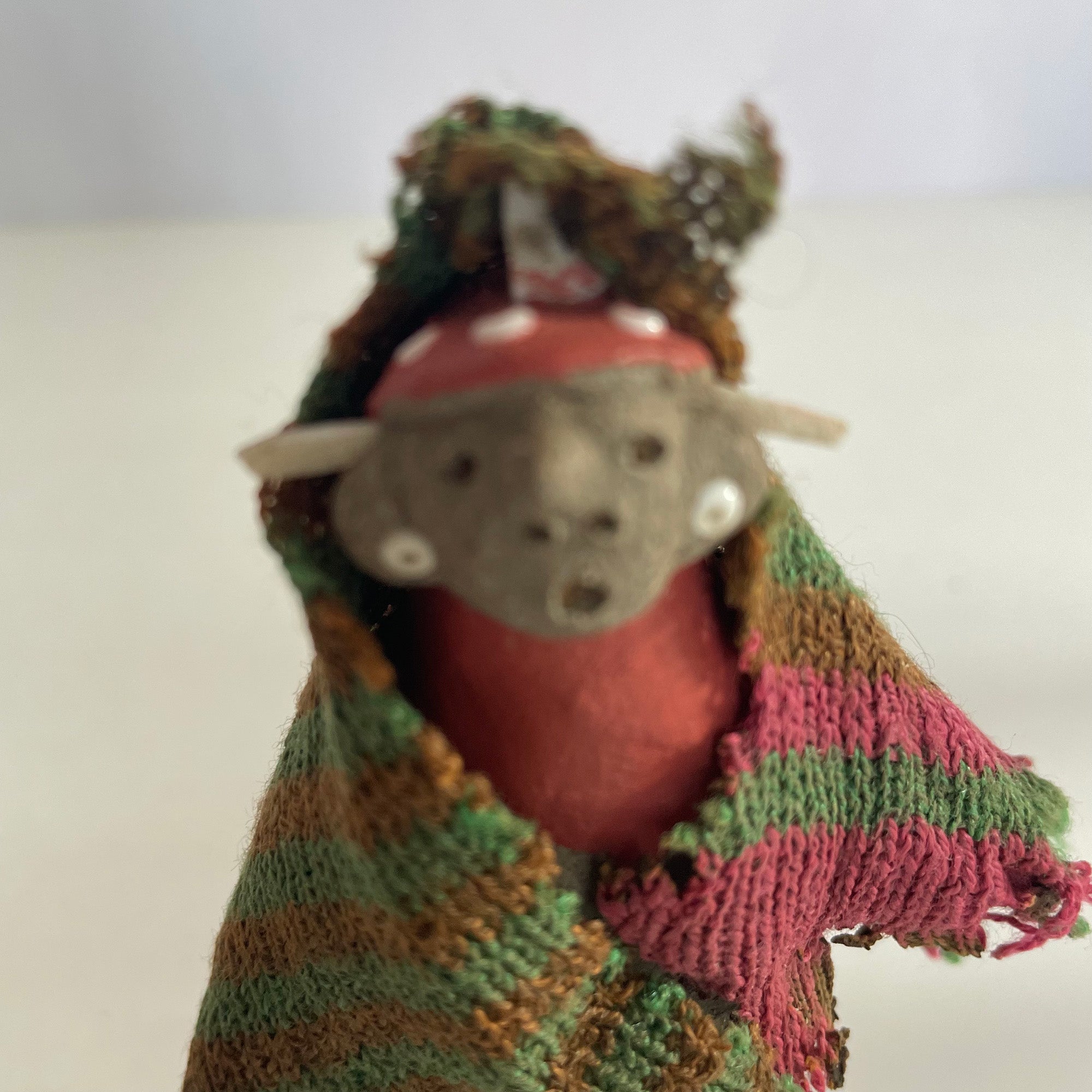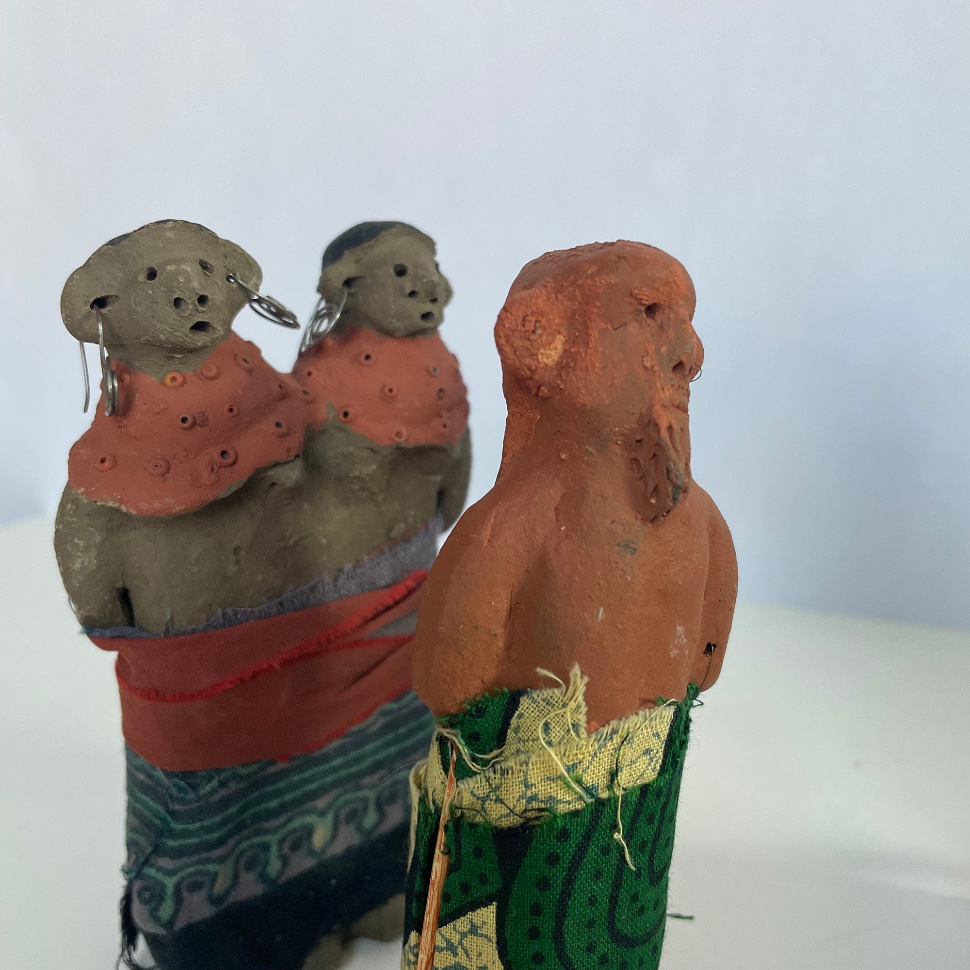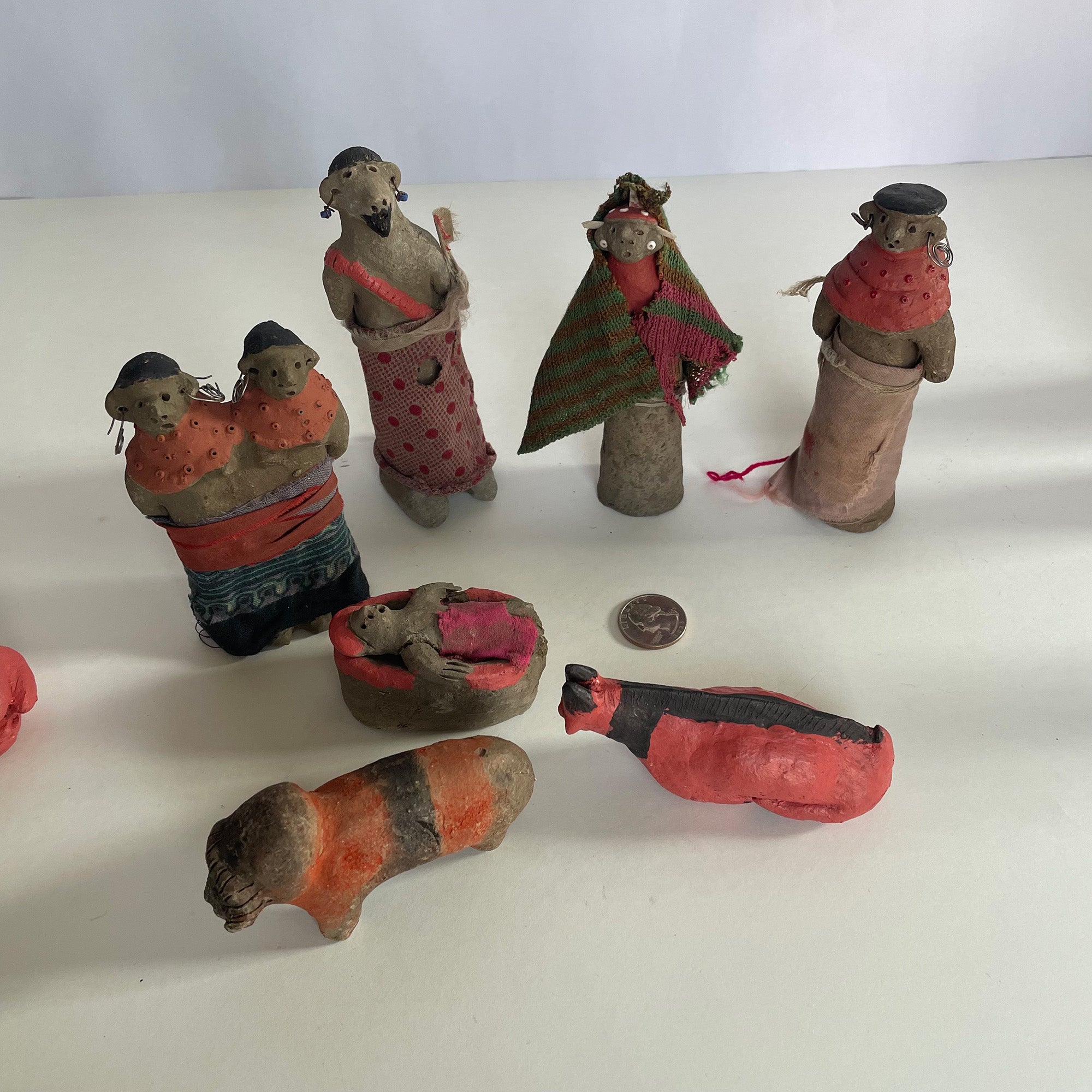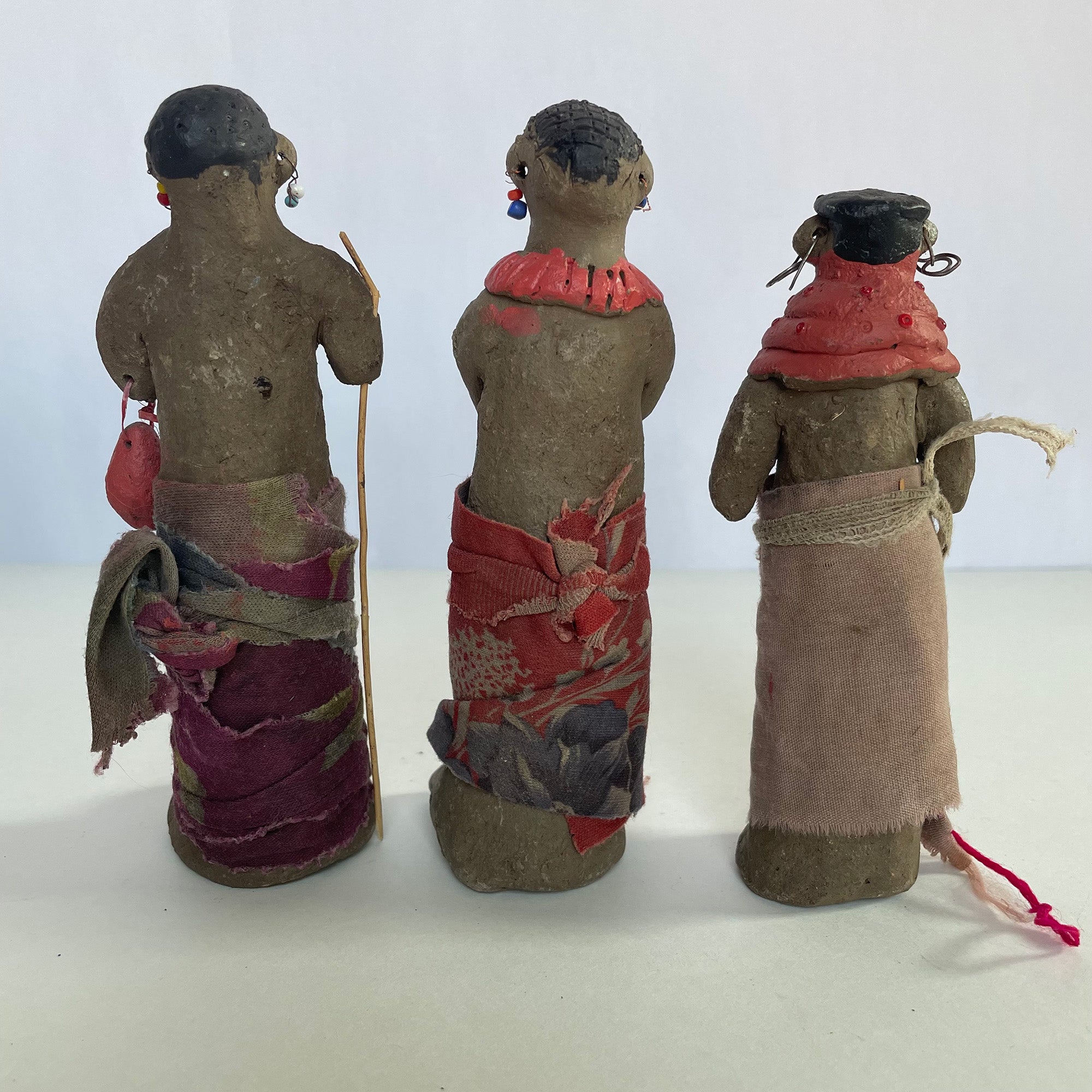 African nativity scene created by the Samburu people in Kenya. This set includes 5 male figures and one double male figure. It also includes one female figure with woven shawl, a baby in a cradle, and three animals. All figures are made of clay and fabric.