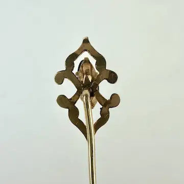 This vintage stick pin features a beautiful amethyst stone, accented by a 14k gold top and gold filled pin. The marquis cut oval stone is surrounded by intricate leaf-shaped gold detailing. Add a touch of elegance to any outfit with this unique and expertly crafted piece.