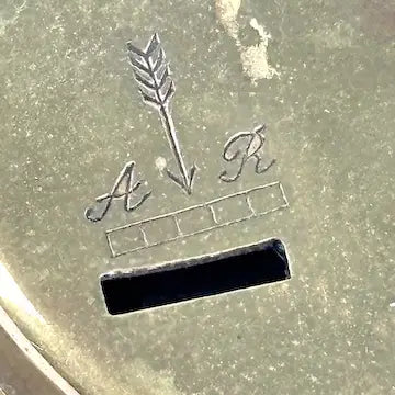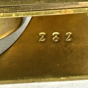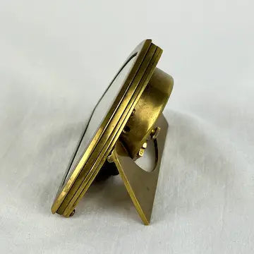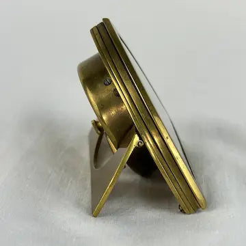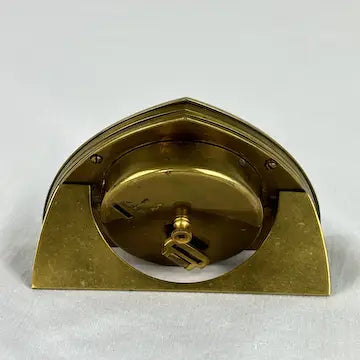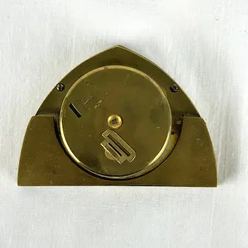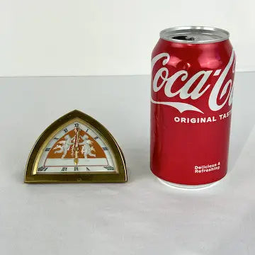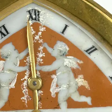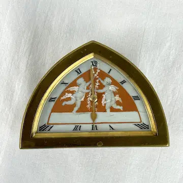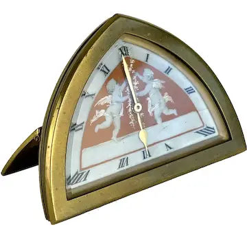 Expertly crafted in Germany, this rare antique analog clock boasts a beautiful hand-painted face featuring delicate garlands of flowers held by two cherubic cupids. Made of high-quality brass, this small triangular clock makes for a charming desktop addition. Add a touch of vintage sophistication to any space.