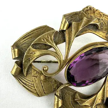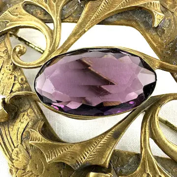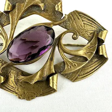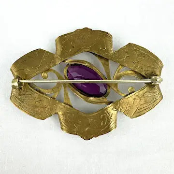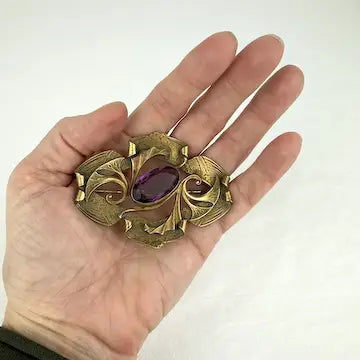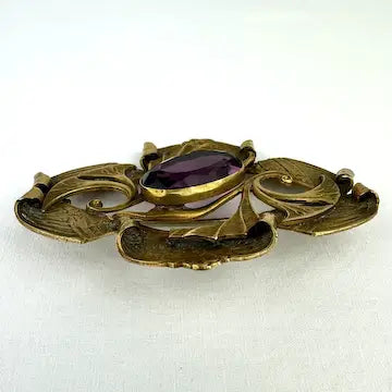 This antique Art Nouveau brooch showcases a stunning amethyst-colored glass gem, bezel set in a gold tone oval frame. Delicate ginko leaf details add a touch of elegance to this timeless piece. Elevate any outfit with this beautiful and unique accessory.