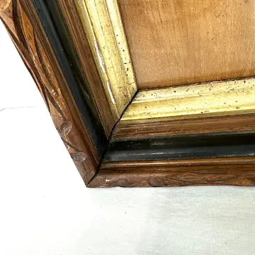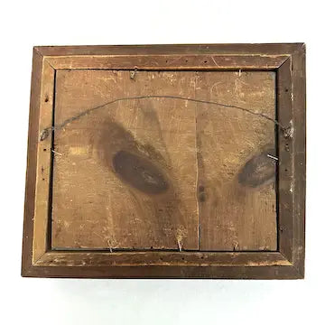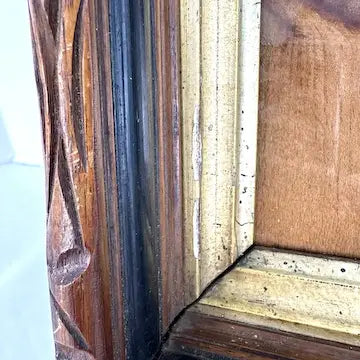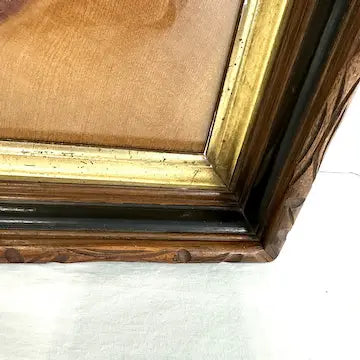 There is some wear to the surface and a little separation at the corners but overall this frame is in great condition for its age. The wood backing panel is split in two but the nails hold it in place.