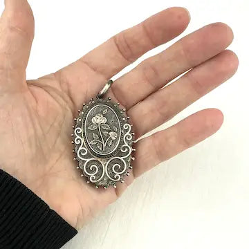 Experience the timeless elegance of our Victorian Sterling Silver Locket. This antique locket features a stunning gold floral applique, accented by Etruscan style sterling silver beads. Its oval shape adds a touch of sophistication and luxury to any outfit. Perfect for cherished memories and heirlooms.
