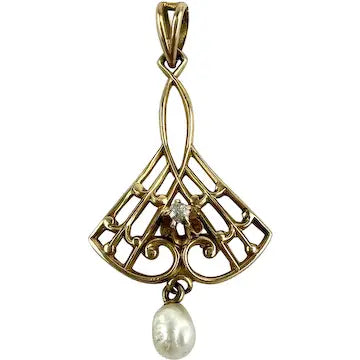 Edwardian 10K Pendant with Diamond Chip and Seed Pearl