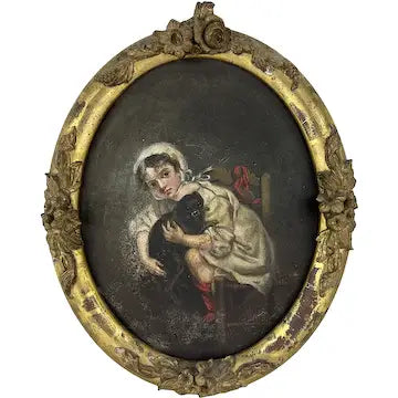 Victorian Oil Painting of a Girl and Her Dog in an Ornate Gilded Frame