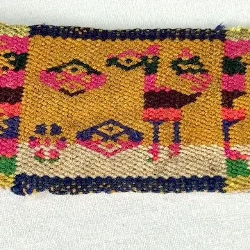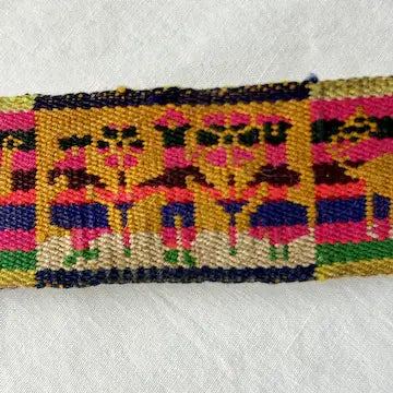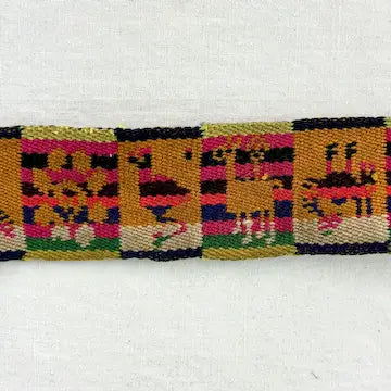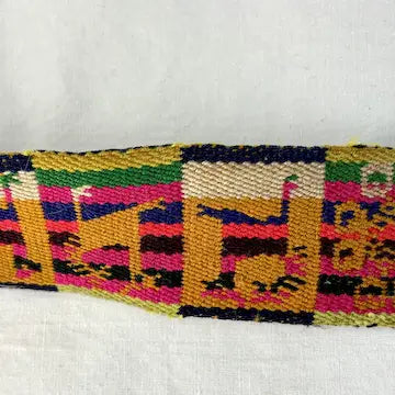 Expertly crafted from soft, hand-woven wool, this antique Bolivian belt is a traditional masterpiece. Vibrant shades of green, pink, purple, and yellow adorn the intricate designs of animals, figures, geometric patterns, and mythological creatures. Elevate your style with this unique and cultural accessory.