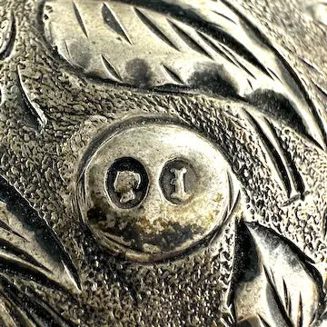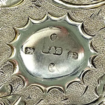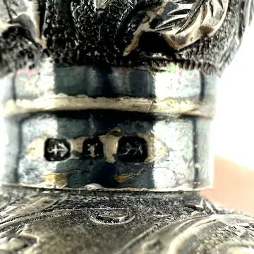 The bottle is hallmarked on the bottom with additional marks on the body and neck of the cap. The marks are as follows: Lion facing left, anchor, Queen Victoria and what I believe is the scripted letter L. This would indicate it was assayed in Birmingham in 1885. It is also marked with the maker’s mark: B & S.