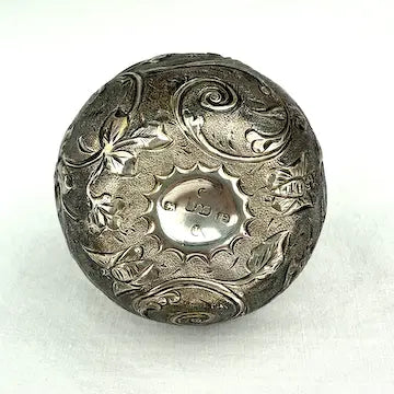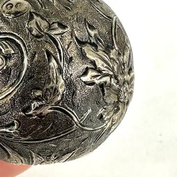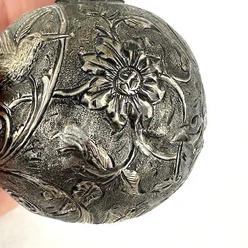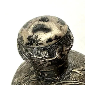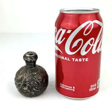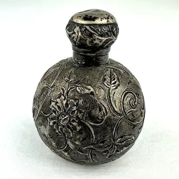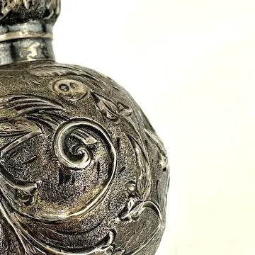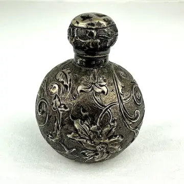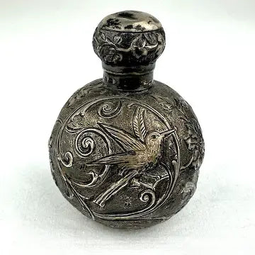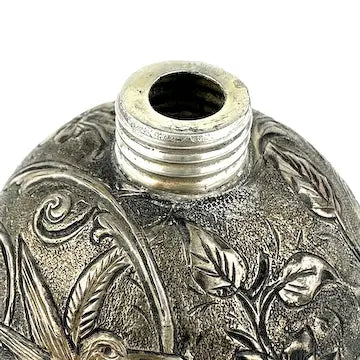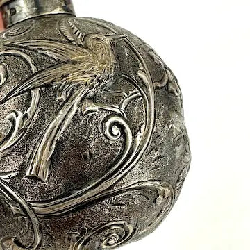 This elegant perfume bottle is a testament to the craftsmanship of the Victorian era. Made of high-quality sterling silver, the intricately detailed repousse design features hand-wrought birds, butterflies, and swirling floral motifs. A truly exquisite addition to any collection.