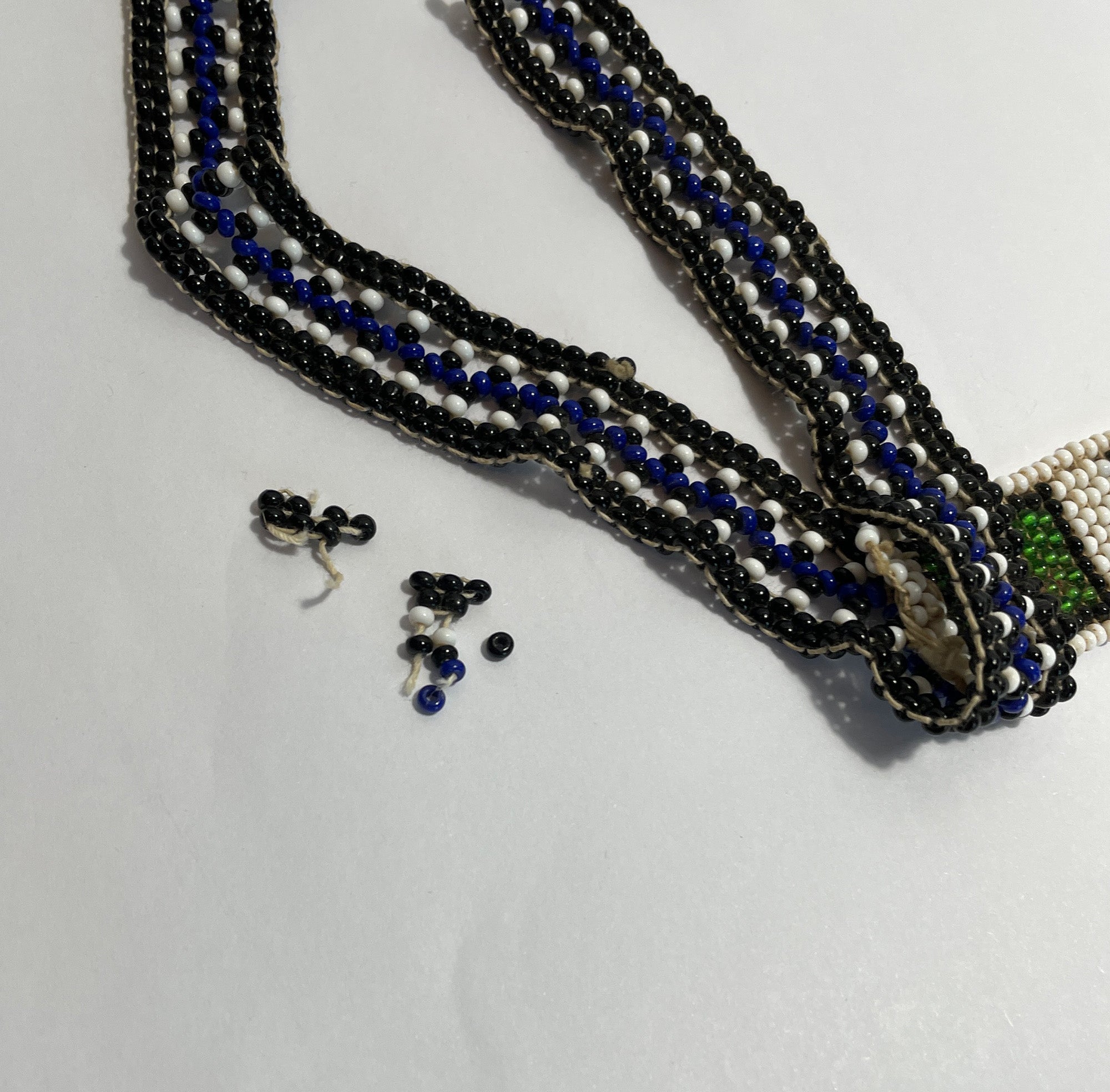 There are 2 areas where the threads are loose or possibly retied to keep the beads on. The beads however all seem secure. There is a small piece of beading that has come off the end of the headband.