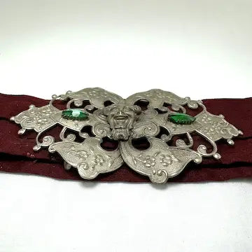 Expertly crafted antique Victorian belt with a unique and eye-catching devil face buckle adorned with Vauxhall green glass stones. Made with high-quality red linen, this belt is a stylish and timeless addition to any outfit.