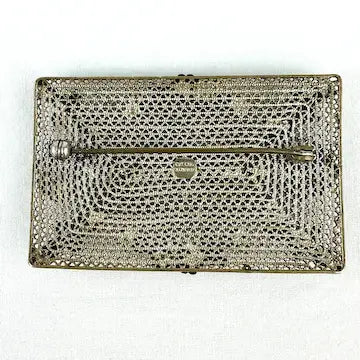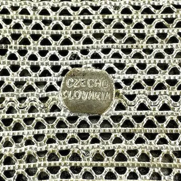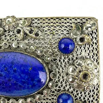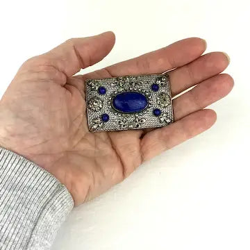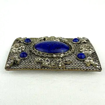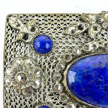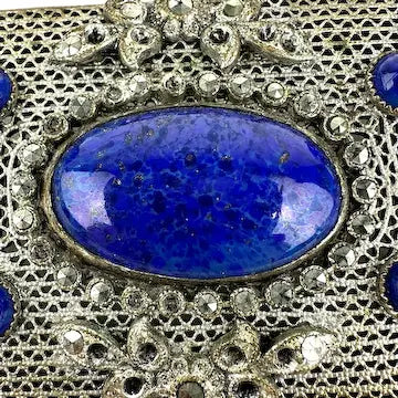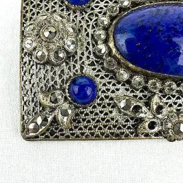 This vintage Czech Lapis Glass Marcasite Brooch showcases an exquisite bezel set lapis glass center bead, expertly accented with shimmering marcasites in a silver tone filigree setting. Crafted in Czechoslovakia, this brooch features a round hinge pin and safety catch for secure wearing. Elegant and timeless.