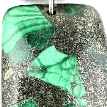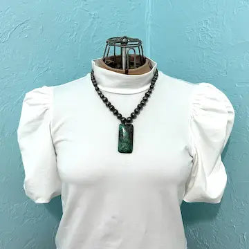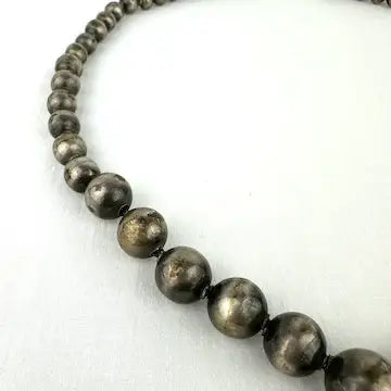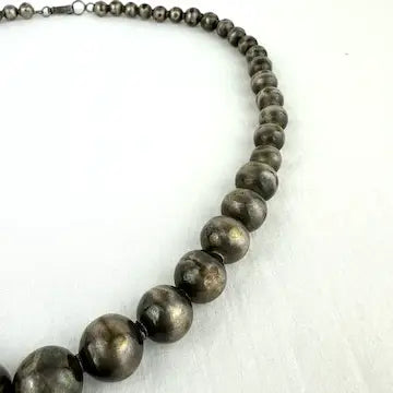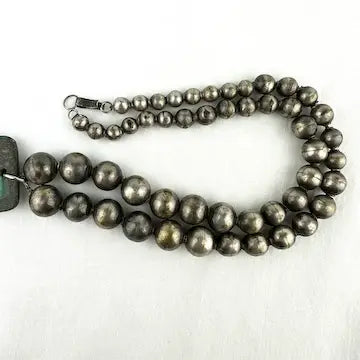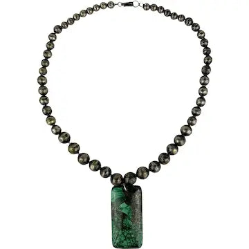 The pendant measures roughly 1.25” x 2.25”. The beads range in size from 6 mm to 12 mm. The necklace length is 20”. Weight is 61 grams.