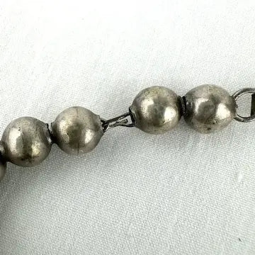 Expertly crafted in the 1940s, this early Mexican silver pearl necklace boasts a stunning malachite pendant and intricate bench beads. Made from Mexican silver, it exudes timeless elegance and a touch of exotic flair. Elevate any ensemble with this unique and rare piece.