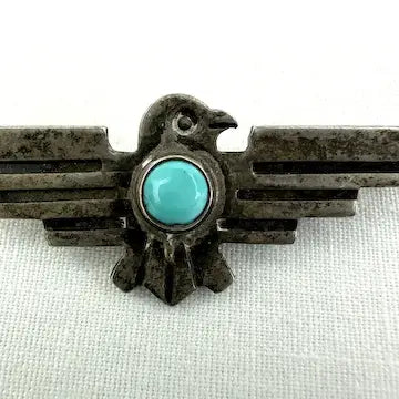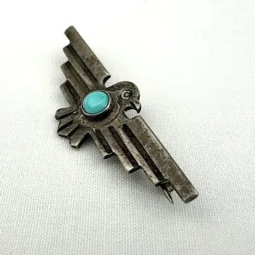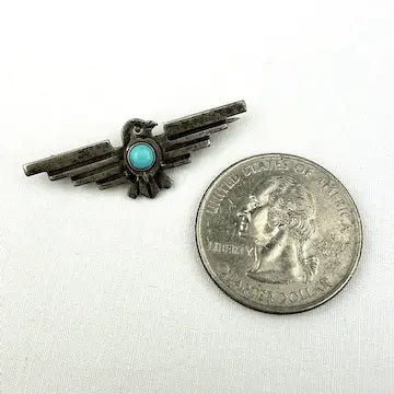 Indulge in the vintage charm of our Fred Harvey Era silver thunderbird pin. Crafted in exquisite sterling silver with a dazzling turquoise stone, this miniature piece is a tribute to Native American culture. Each hand-stamped detail and bezel set gem adds to its alluring elegance. Circa 1930s.