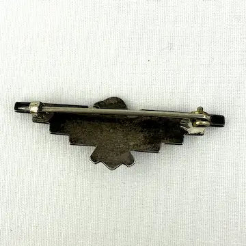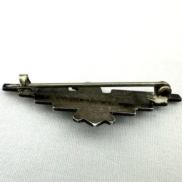 The pin measures 1 3/8” x 1/2”. It weighs 2.25 grams. The metal is not marked but did test positive for silver.