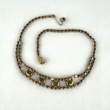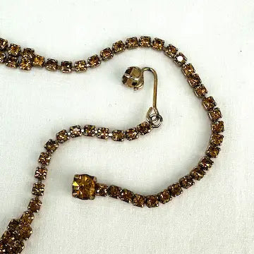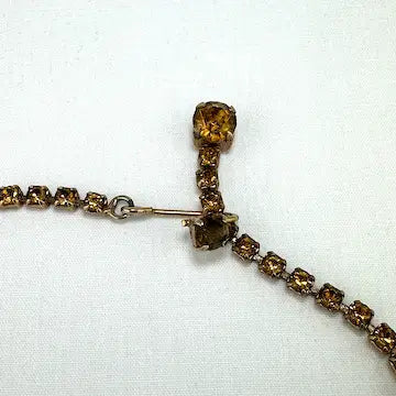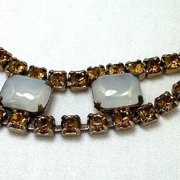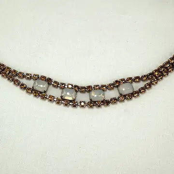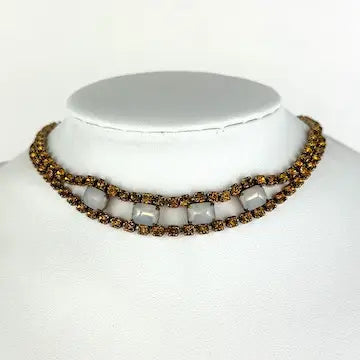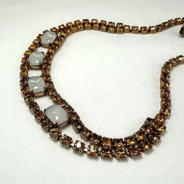 Discover the elegant charm of the midcentury choker necklace, a perfect addition to any vintage collection. This beautiful choker features 4 faux moonstone glass beads, each surrounded by amber colored rhinestones that are prong set in stunning gold tone metal. Add a touch of sophistication to any outfit with this timeless piece.