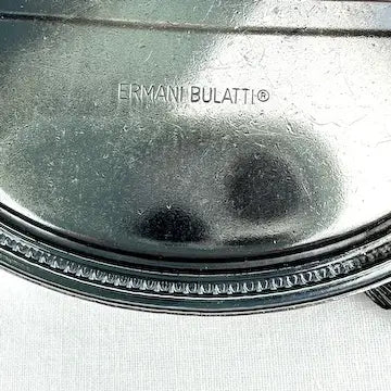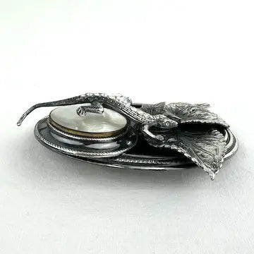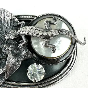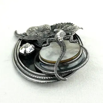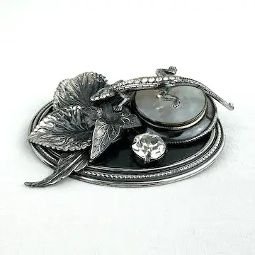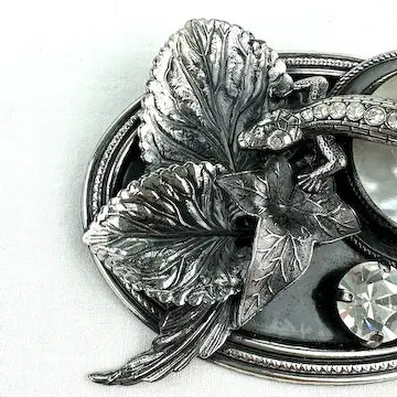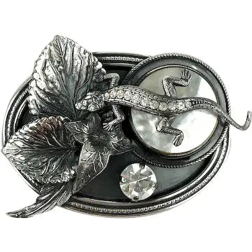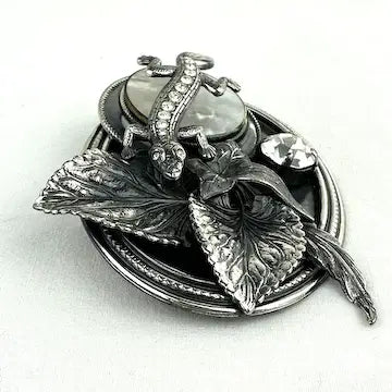 Expertly crafted and oozing with vintage charm, this Ermani Bulatti art nouveau style brooch adds a touch of elegance to any ensemble. A rhinestone covered silver lizard sits atop a Mother of pearl disc, adorned with delicate silver leaves. A must-have for any collector or lover of timeless fashion.